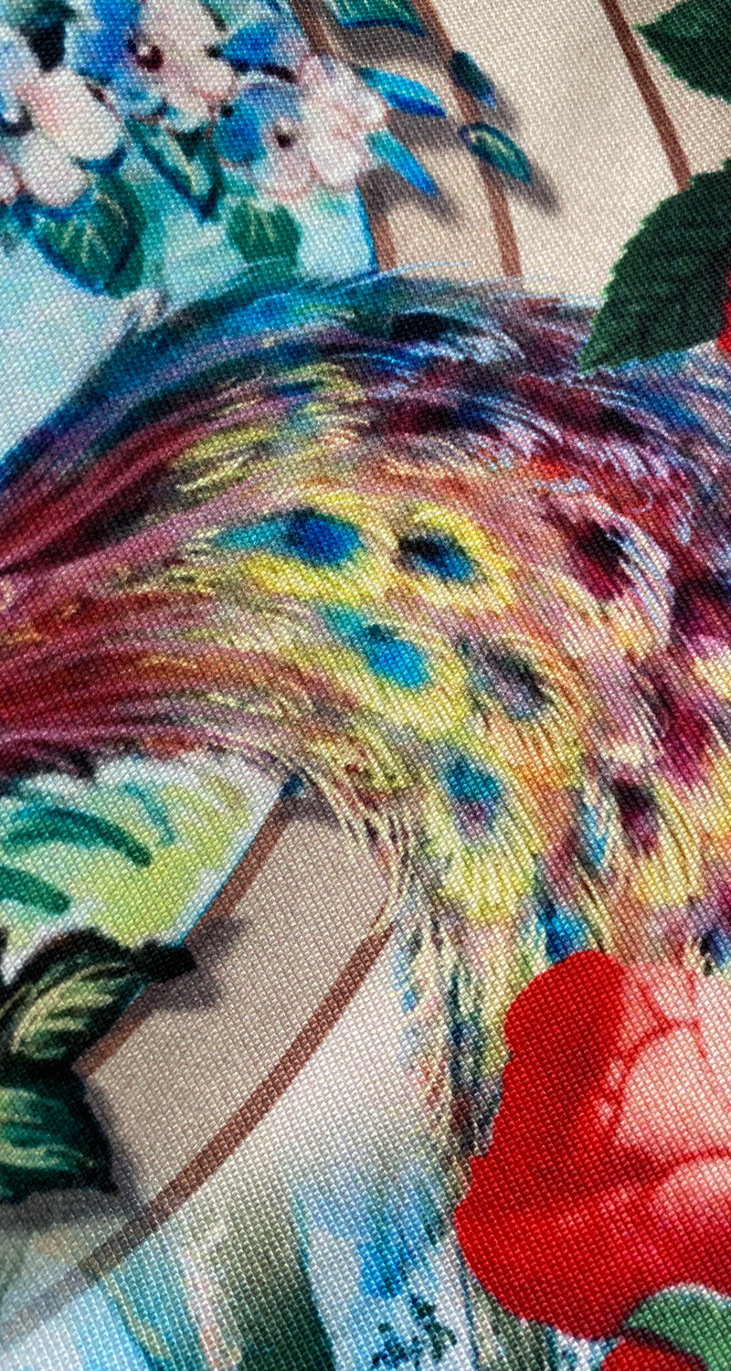 Vestido Maxi Multicolor con estampado de pavo real, escote en V cierre en centro espalda y detalle de malla. Talla PP de la marca.