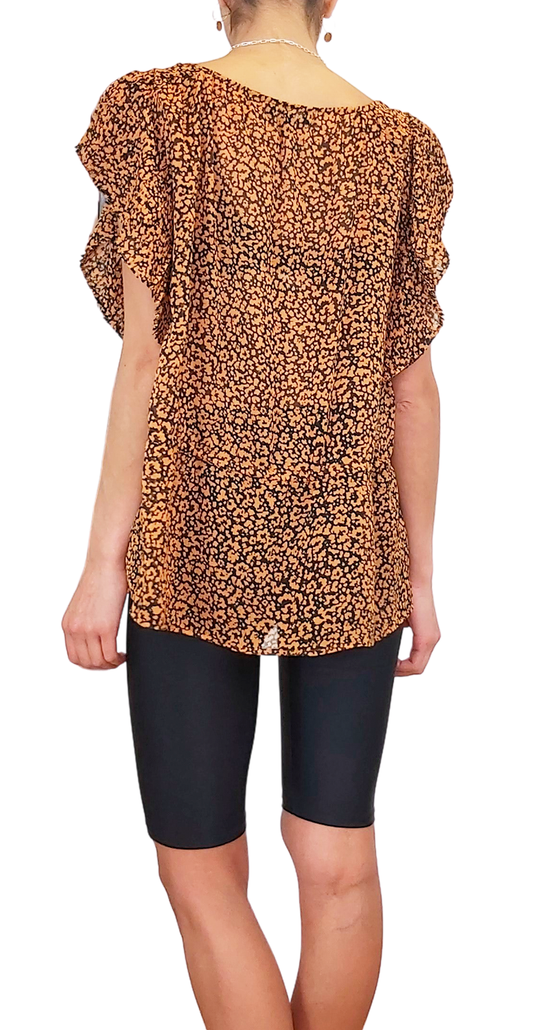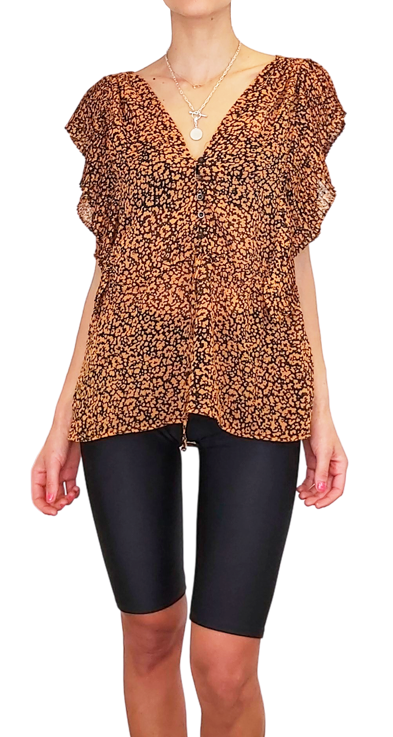 Blusa manga corta con escote en V. Estampado Animal Print en tonos Naranjo y Negro. Plisados decorativos en mangas y lazo ajustable en cintura.