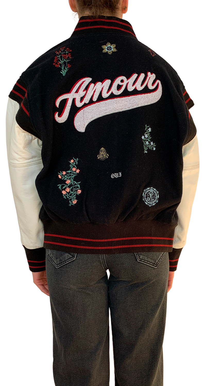 Chaqueta bomber de lana Negra con mangas de cuero Blancas. Tiene multiples aplicaciones bordadas, parches y gemas.