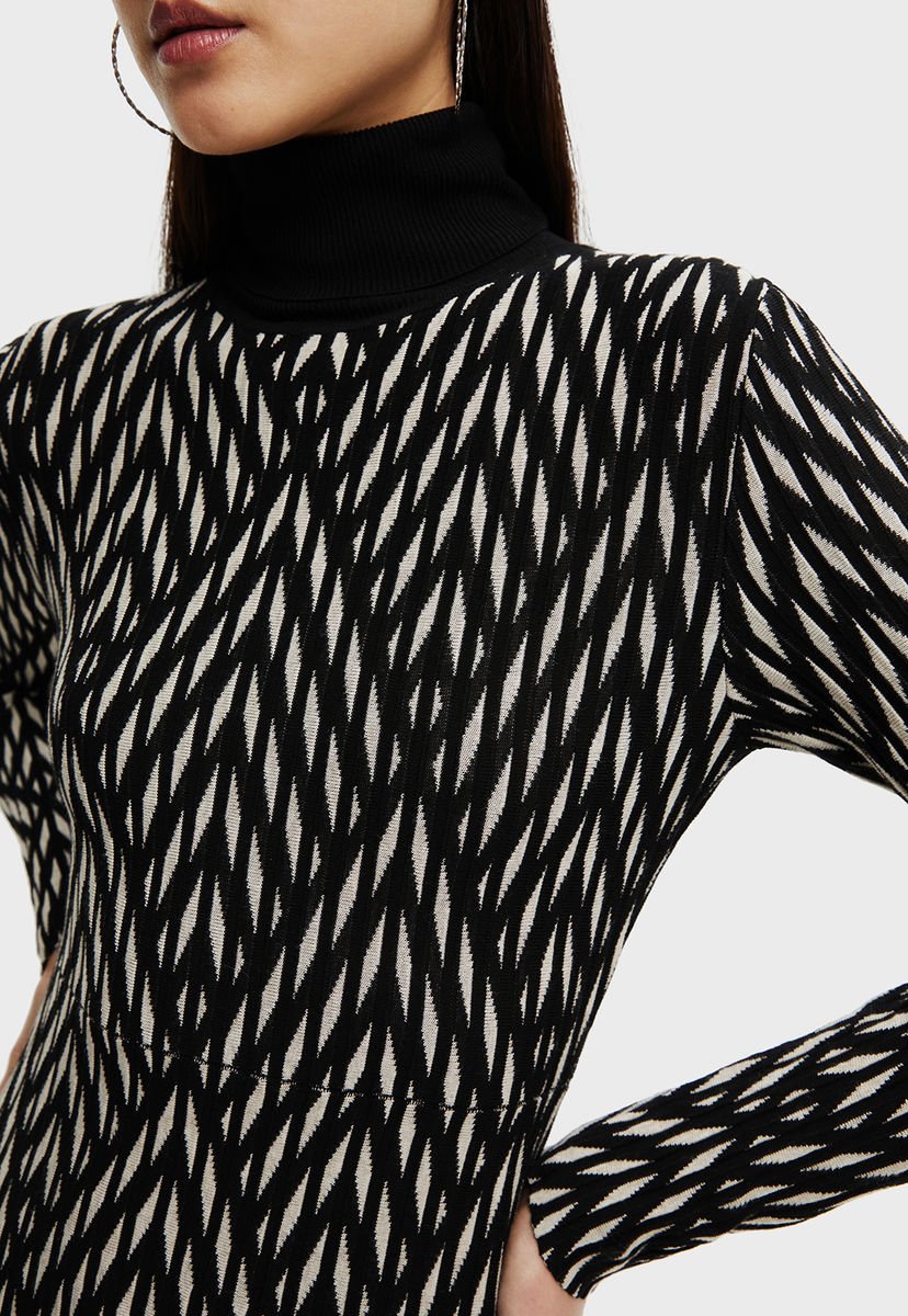 Características: Un vestido de punto diseñado para que siente muy bien a cualquier silueta por su corte evasé. Tiene un diseño geométrico en blanco y negro confeccionado con fibras eco-friendly.