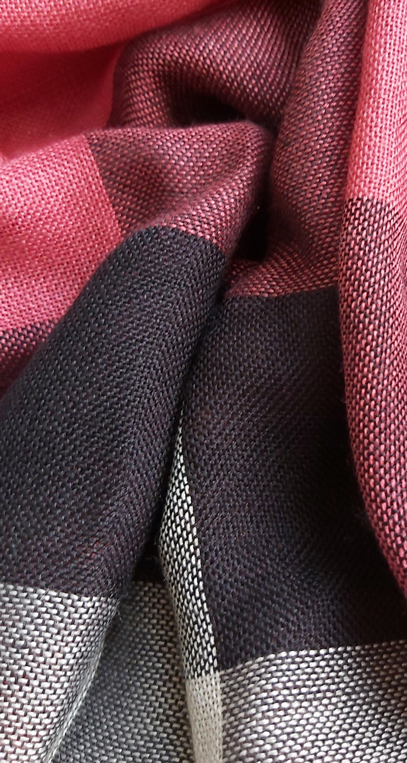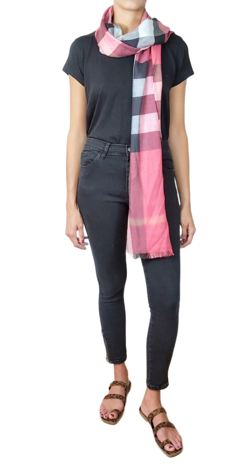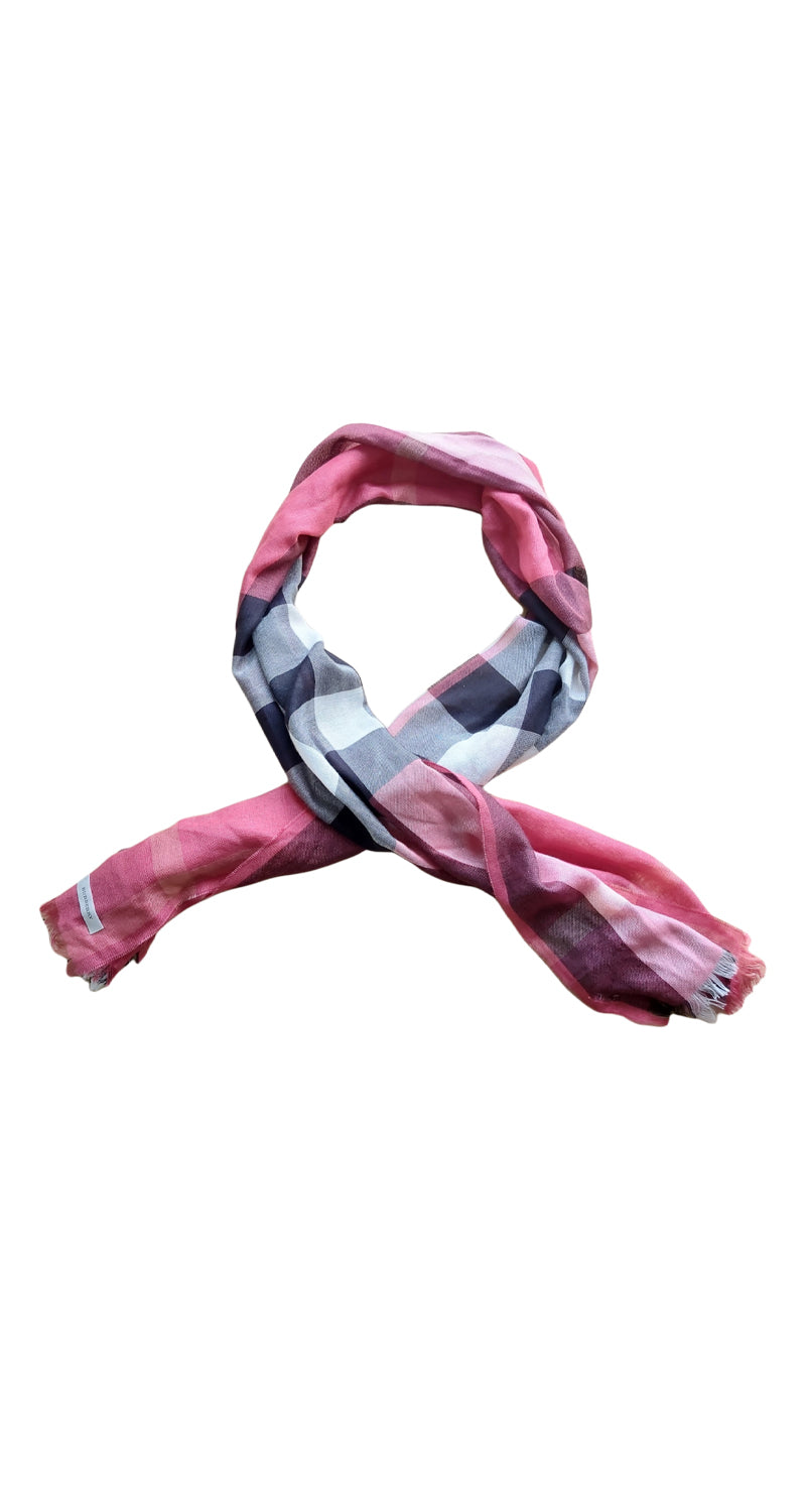 Bufanda de Seda cuadros en tonos Rosados y Rojos. Medidas: 175 cm x 50 cm. Con leves signos de uso.