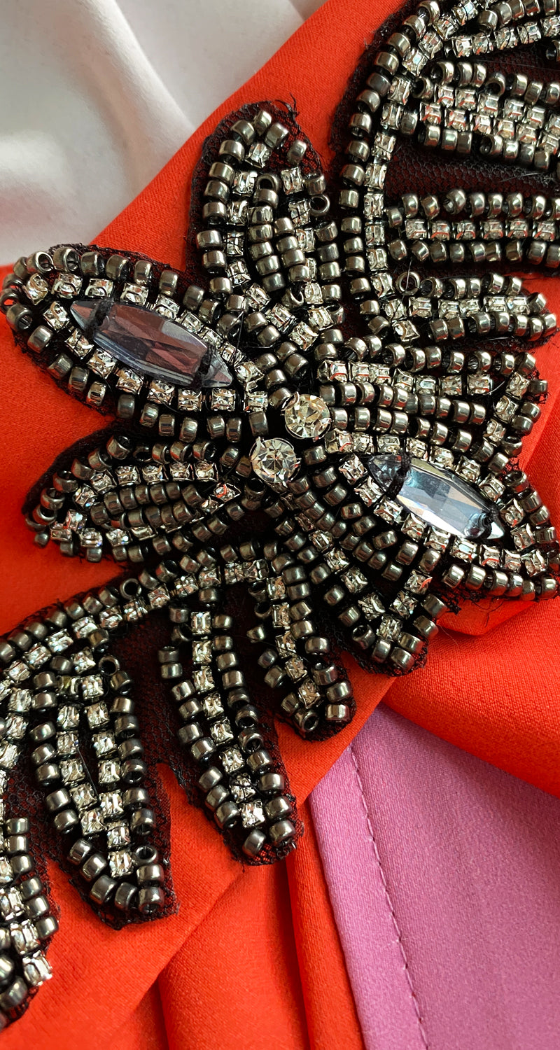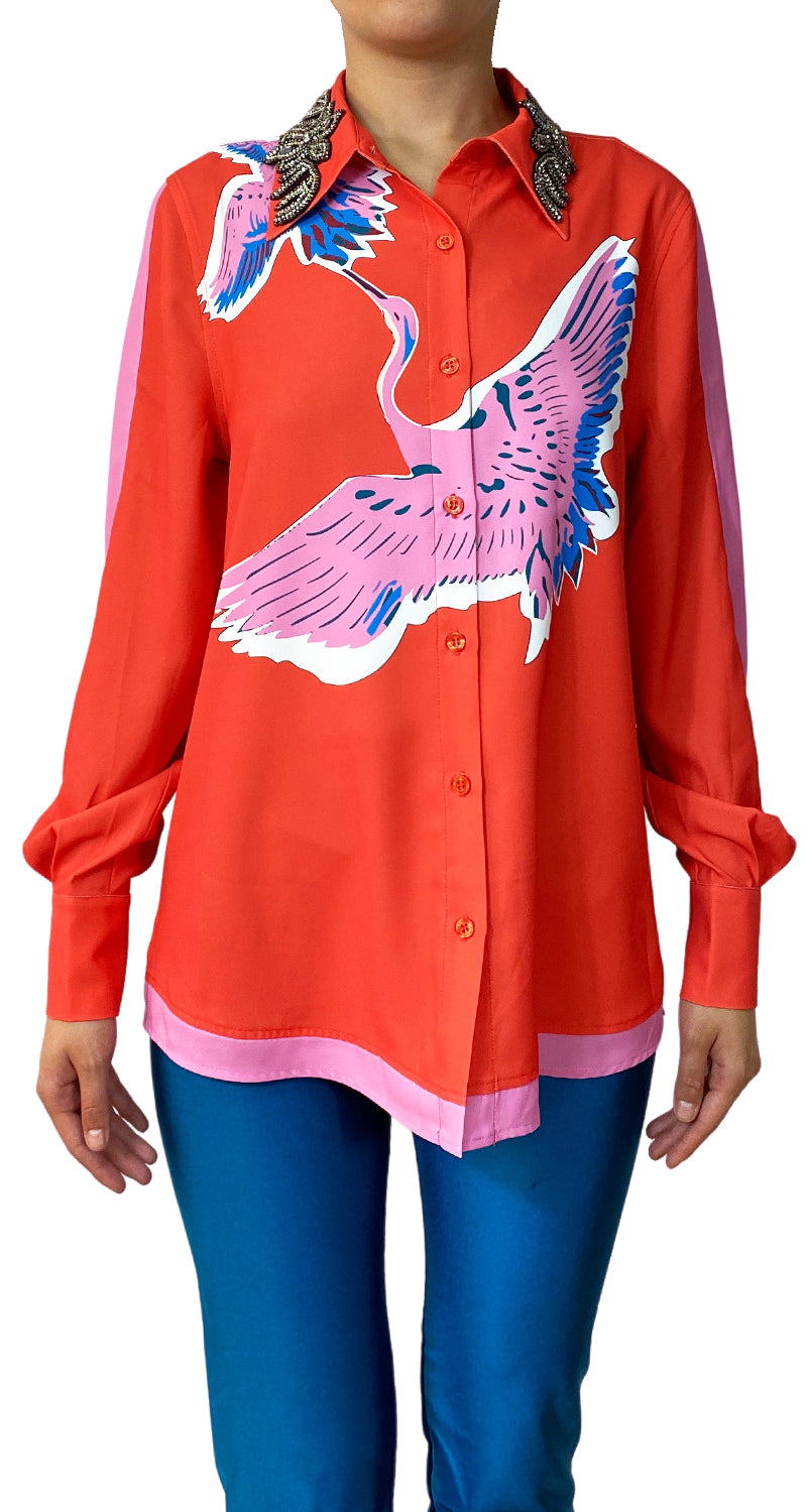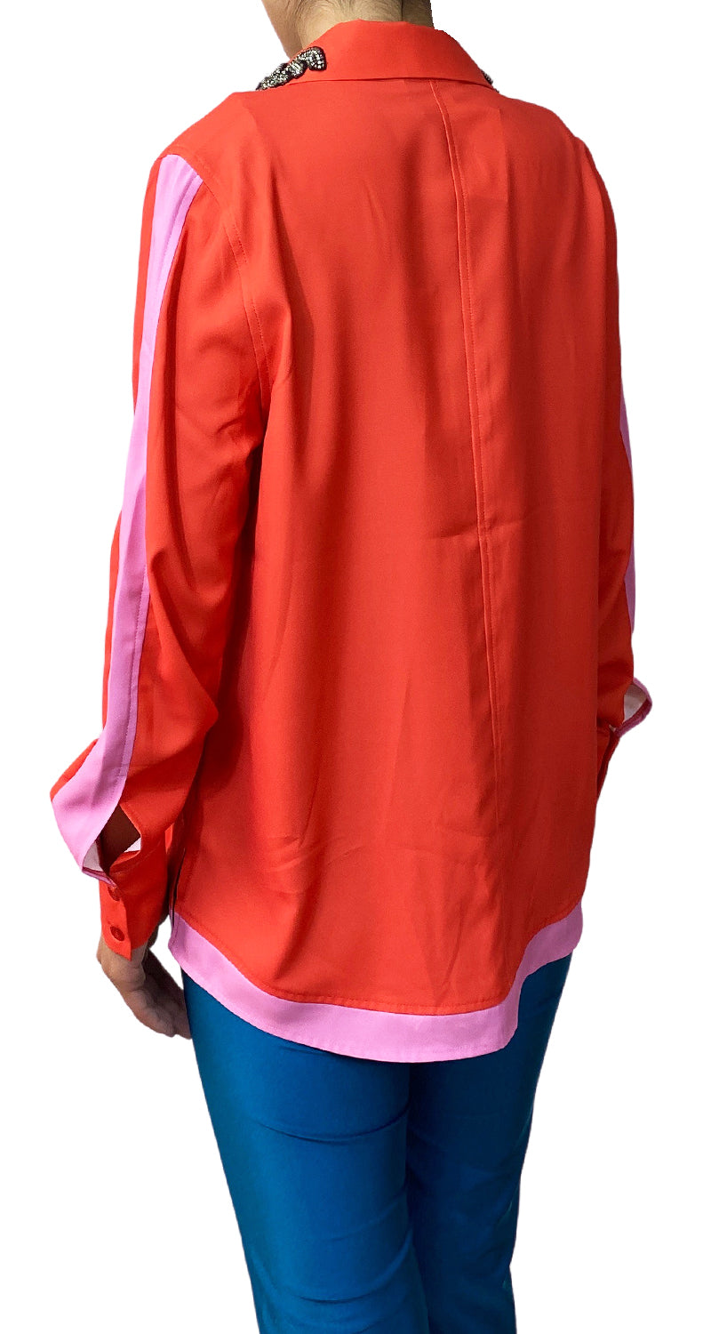 Blusa color Rojo con franjas rosadas, estampado en delantero y detalle de mostacillas en cuello.
