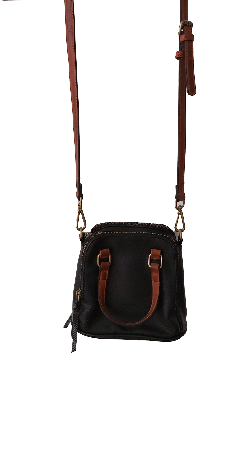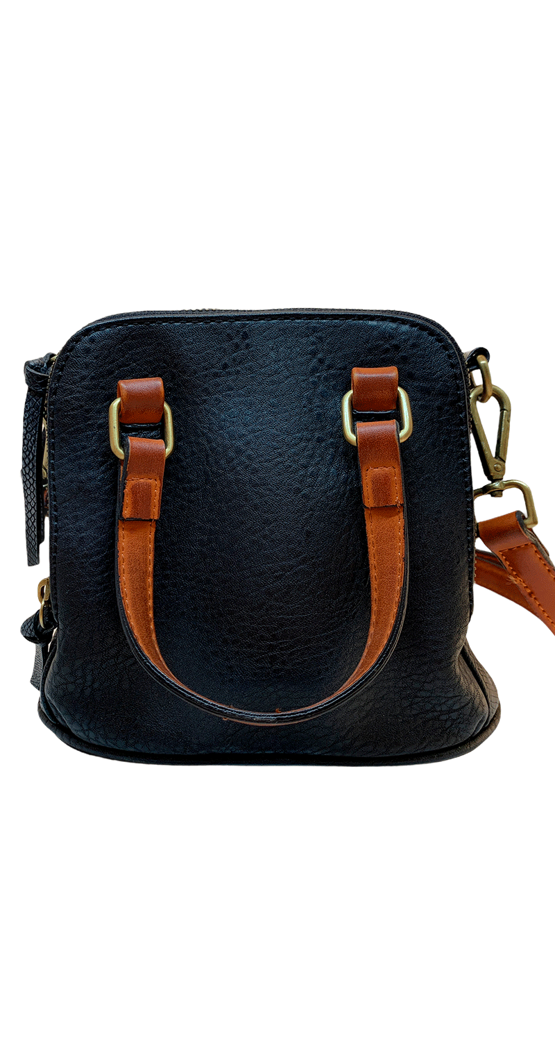 Bandolera negra con multiples bolsillos, detalles y strap en eco cuero Café envejecido.