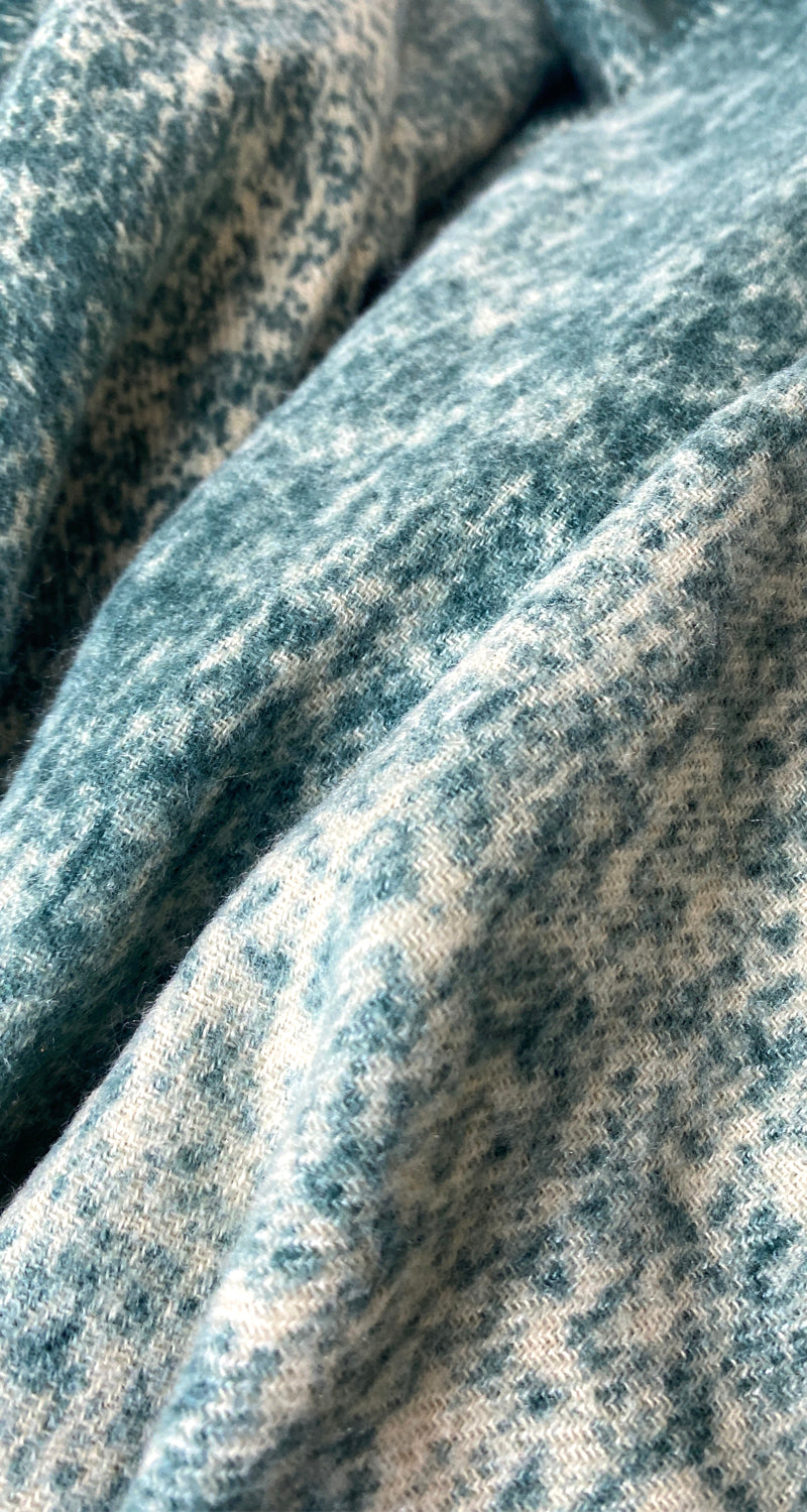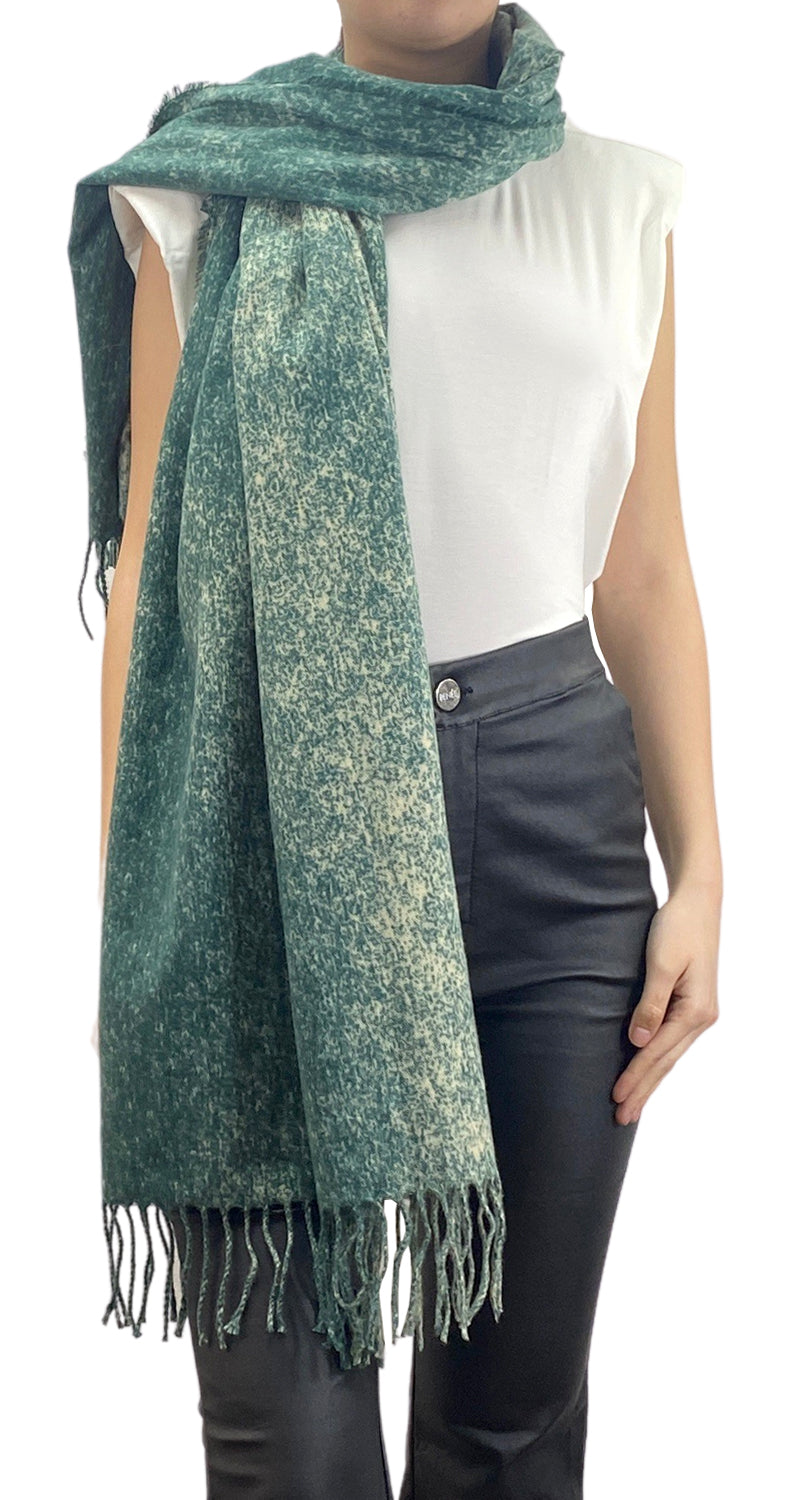 Echarpe color Verde con estampado y flecos en ruedo. Medidas: 68 cm x 170 cm.