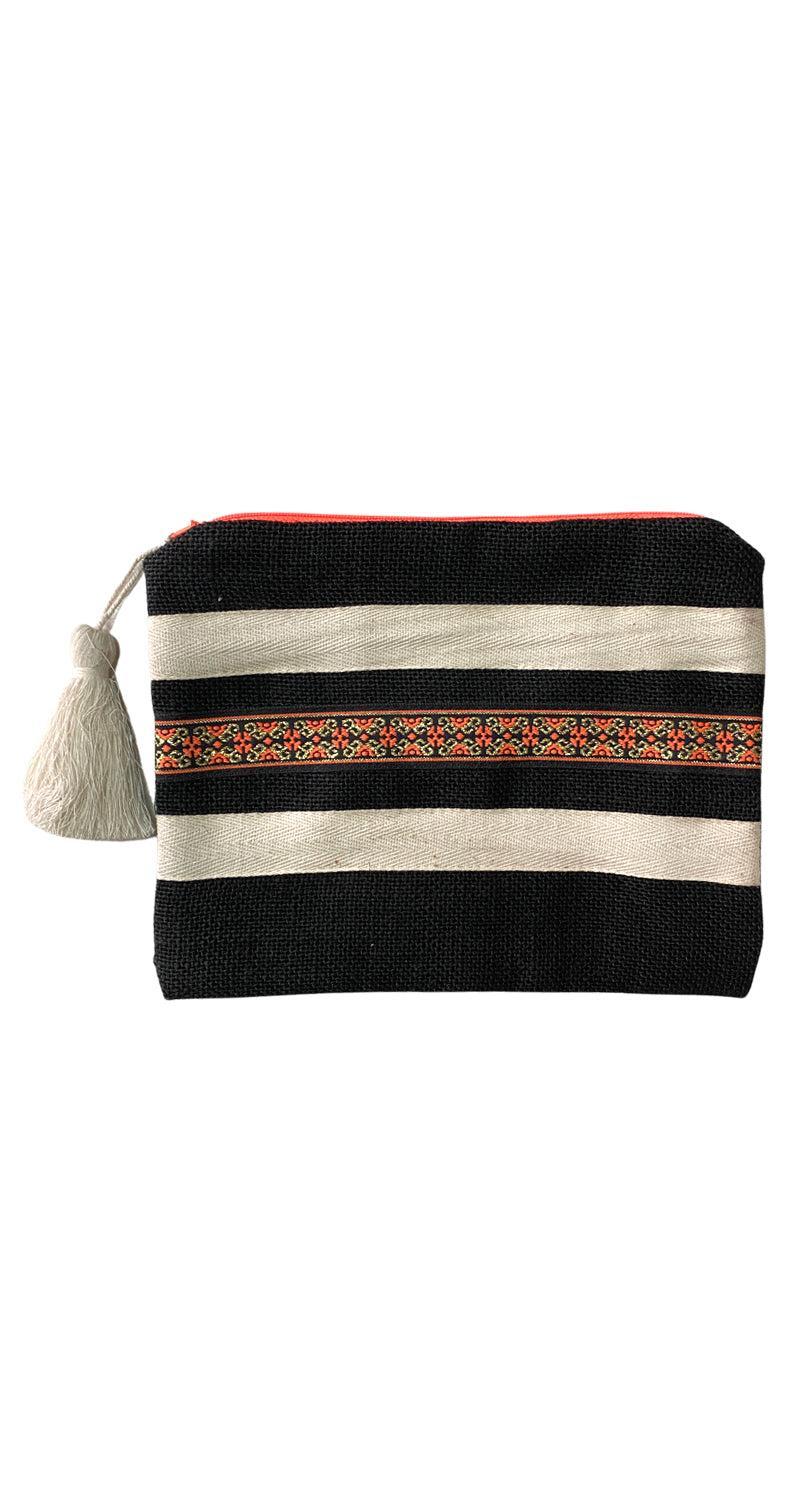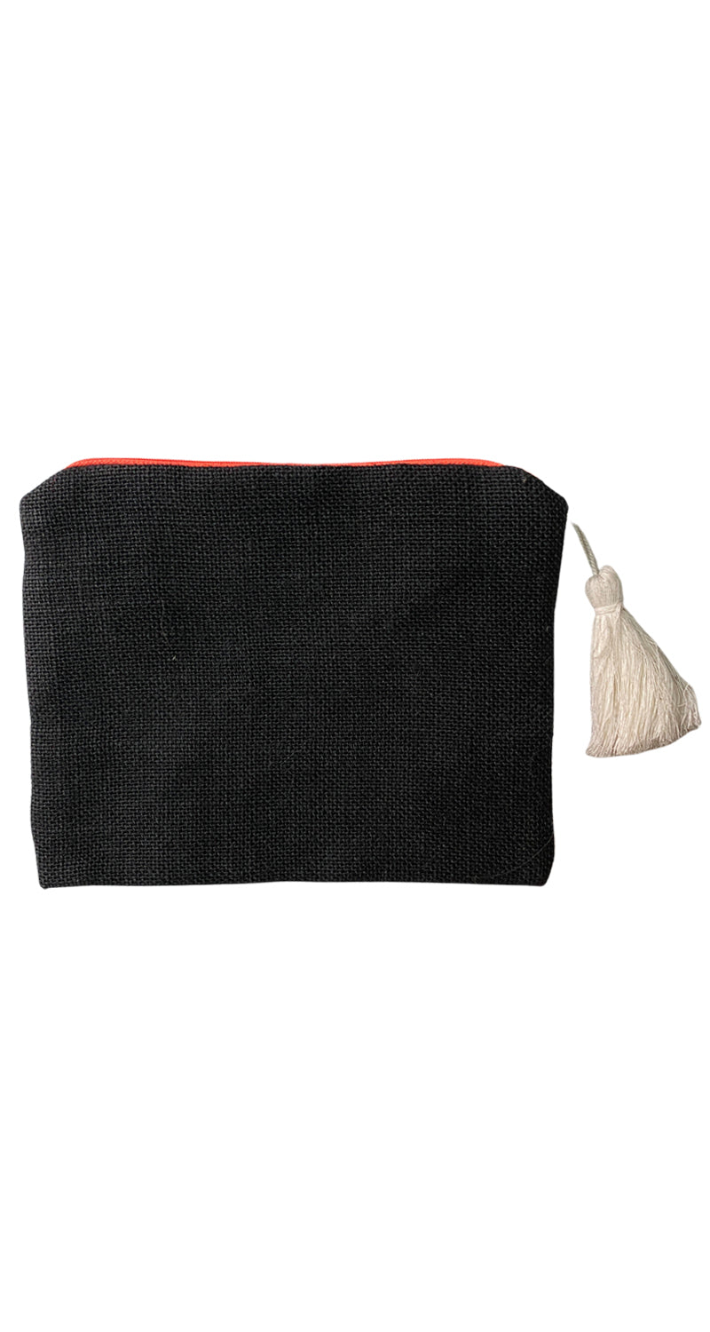 Estuche tejido en color Negro con líneas en Blanco y Multicolor, cierre Naranja con pompón. Medidas: 24 x 19 cm.