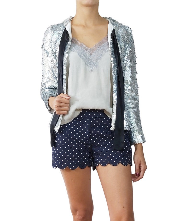 Chaqueta de lentejuelas plateadas con lazo en delantero .