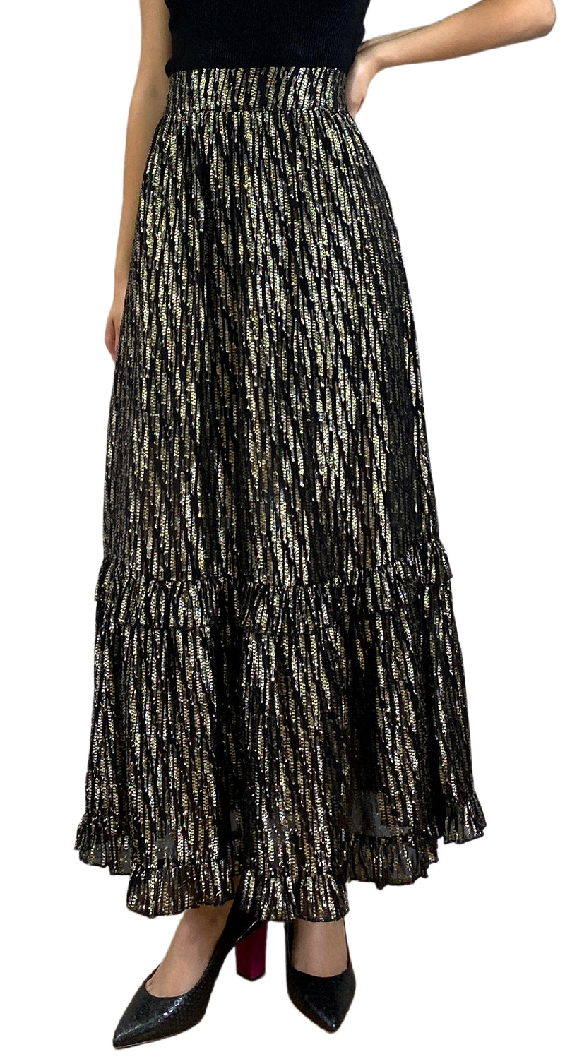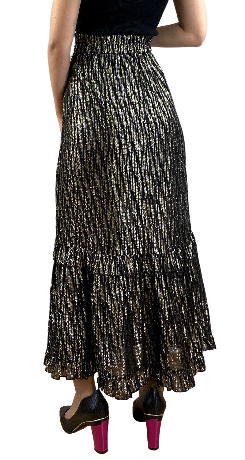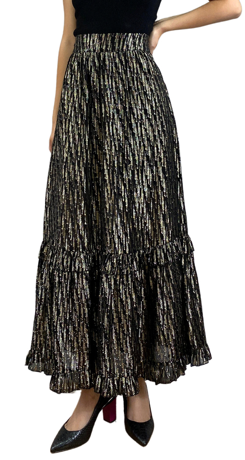 Falta Maxi color Negro con estampado Metalizado, vuelos en inferior y pretina con elástica. Altura de modelo 1,68