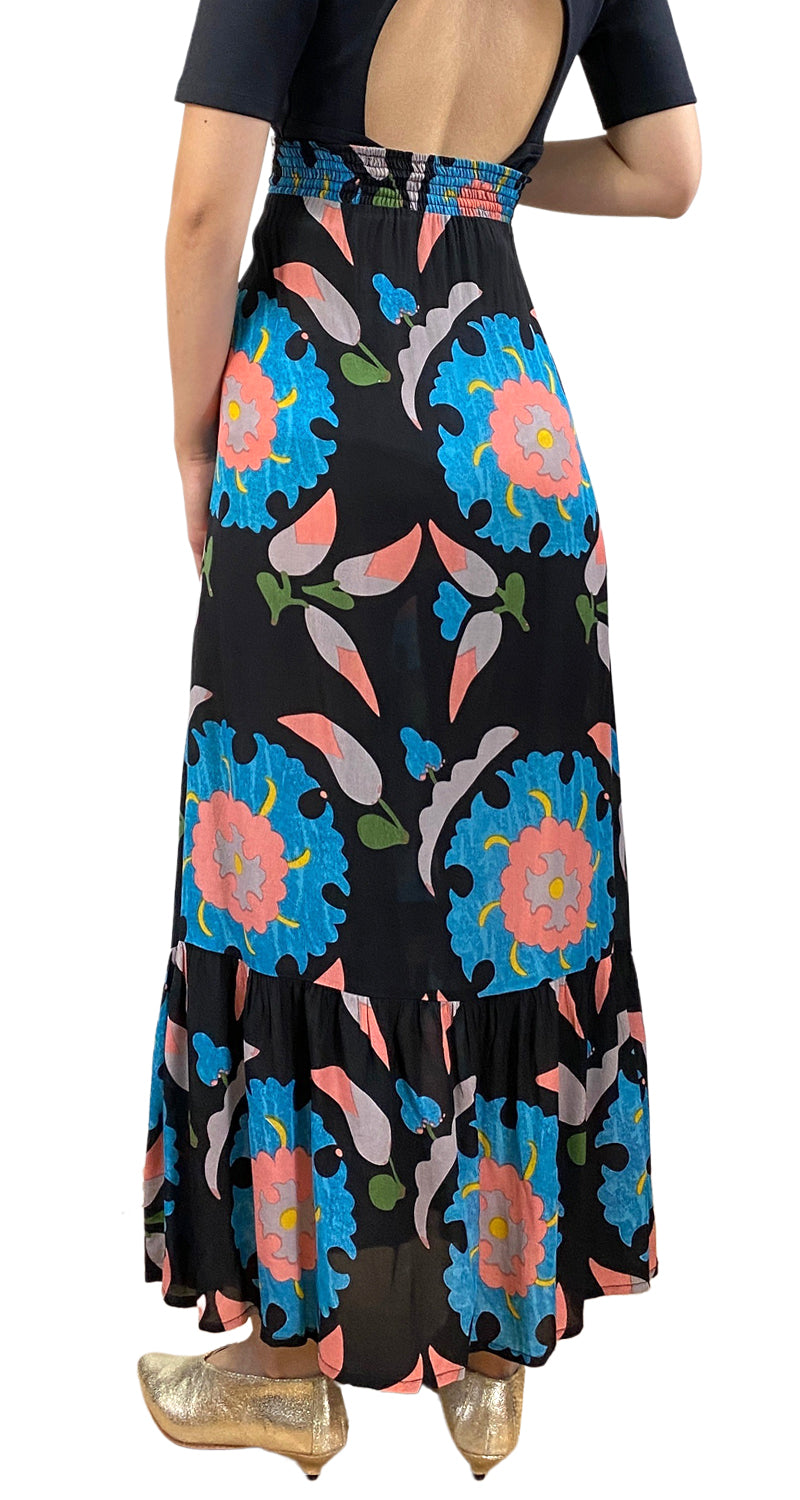 Falda color Negro con estampado Multicolor, botones en delantero y vuelos en inferior, pretina fruncida con aplicaciones de espejos, altura de modelo 1,68
