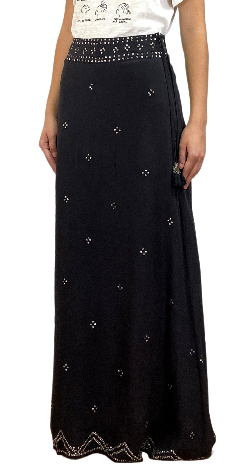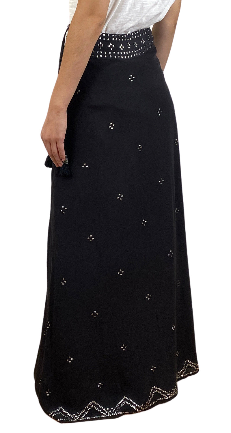 Falda Maxi color Negro con aplicaciones de lentejuelas Plateadas, cierre lateral con lazo y pompones.