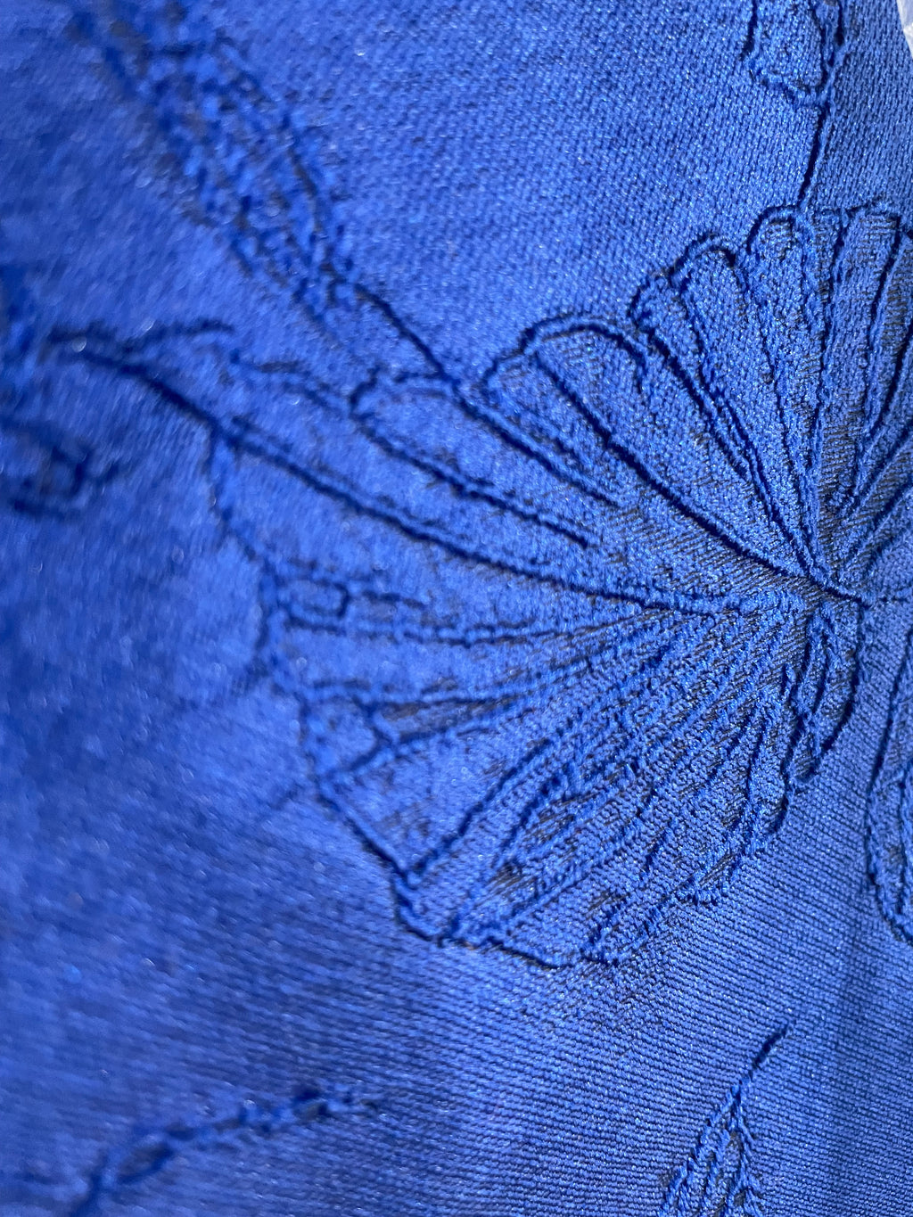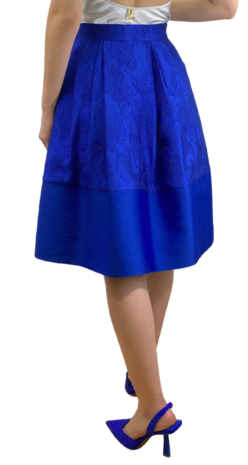 Falda Midi con plises, color Azul con estampado estilo Jacquard, parte inferior satinado. Talla 2 de la marca. Altura de modelo 1,68