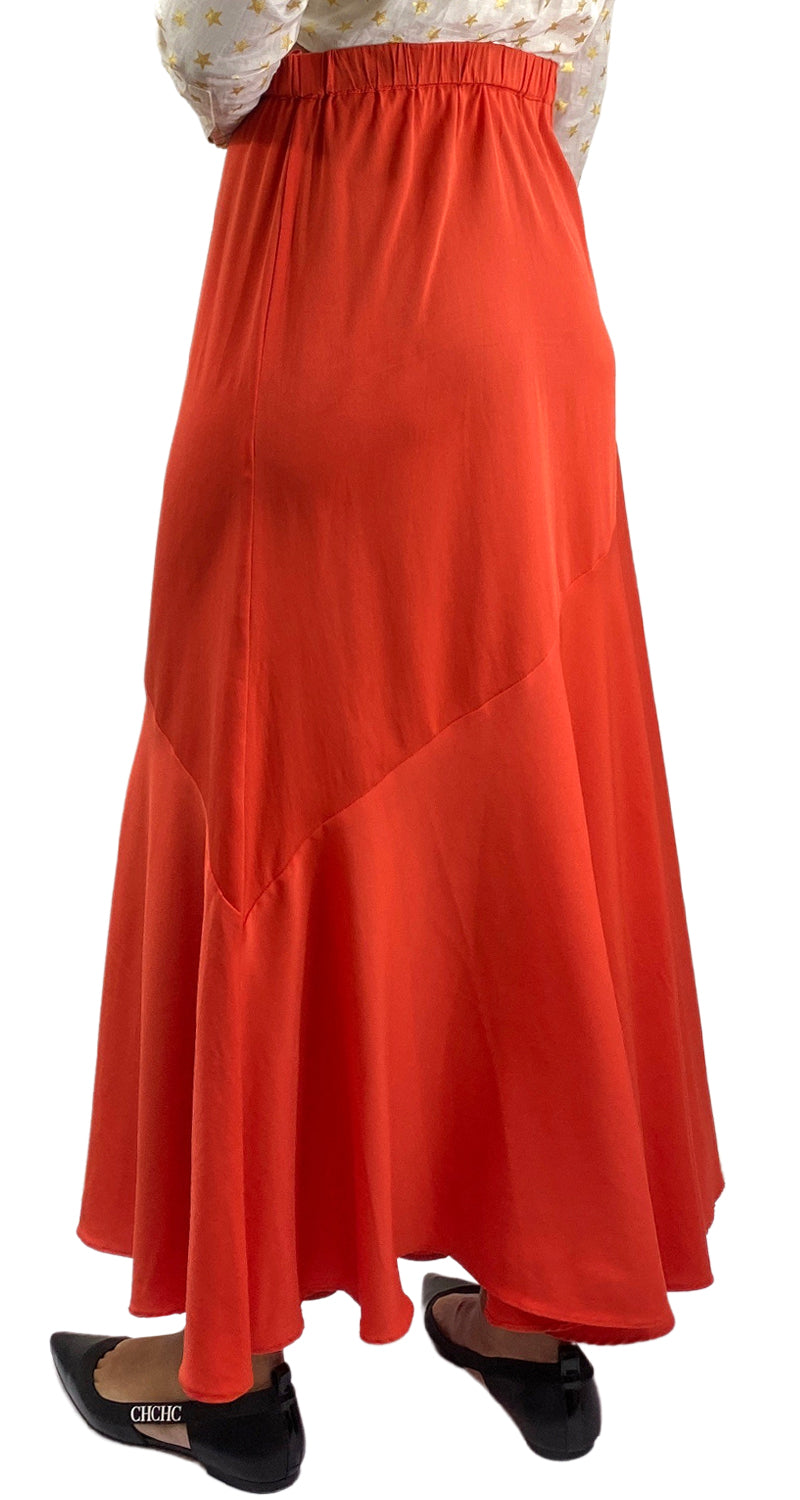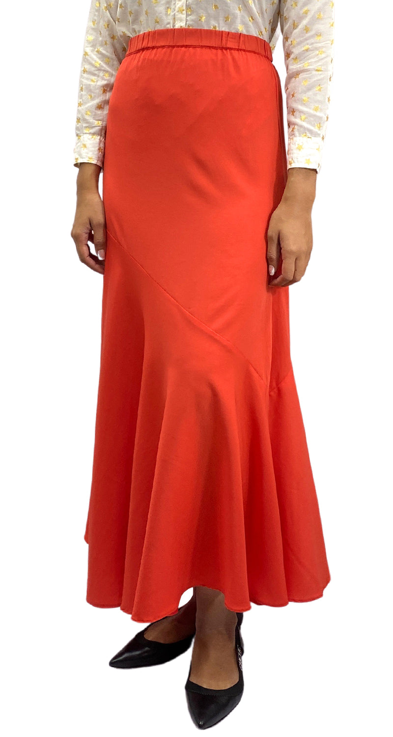 Falda maxi color Rojo coral con pretina elasticada. Altura modelo 1.76.