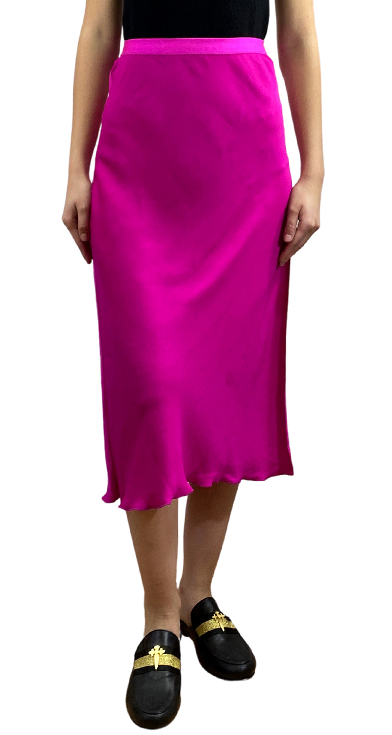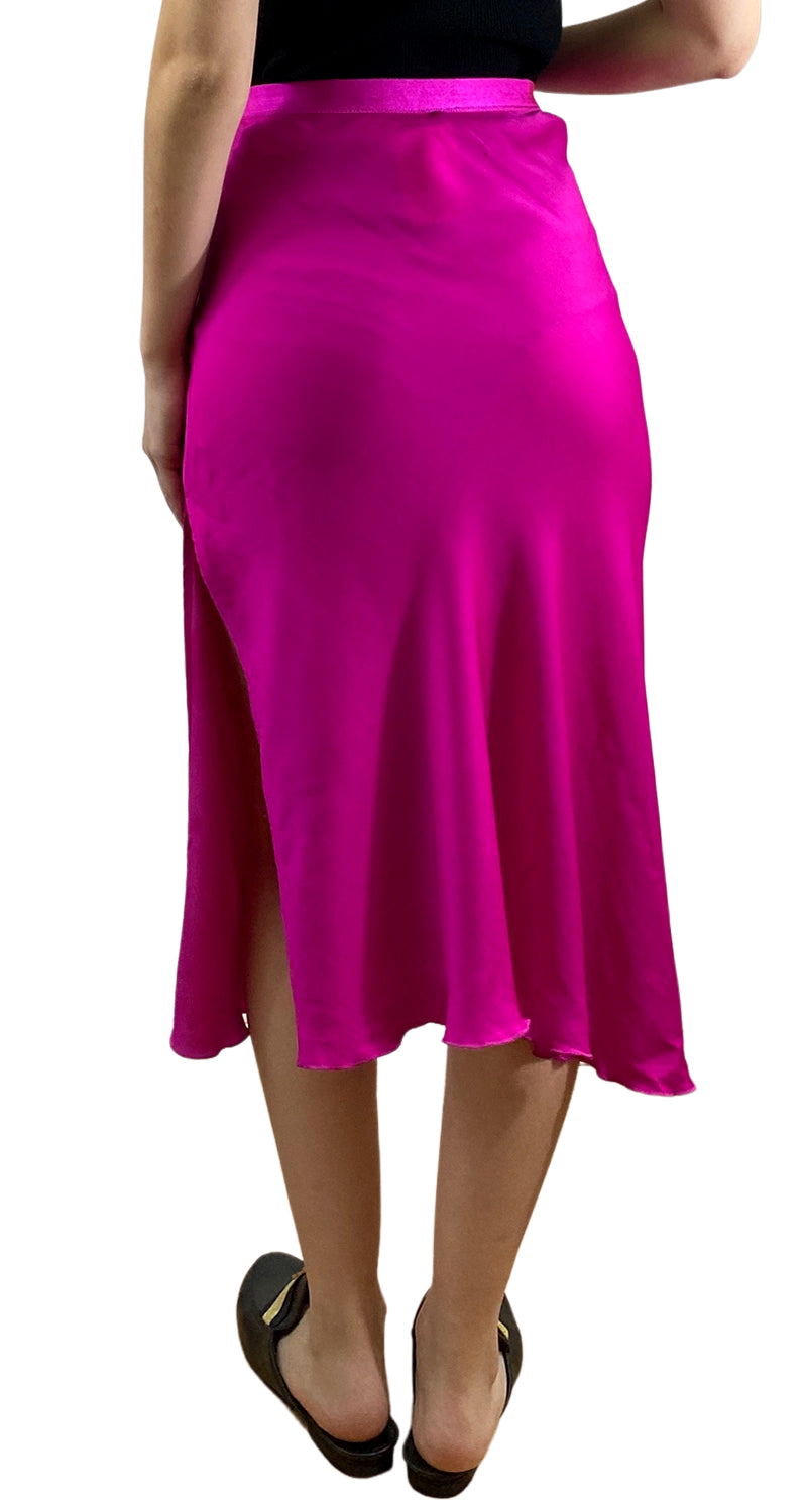 Falda Midi en color Fucsia con abertura en lateral y pretina elasticada. Altura de modelo 1,68