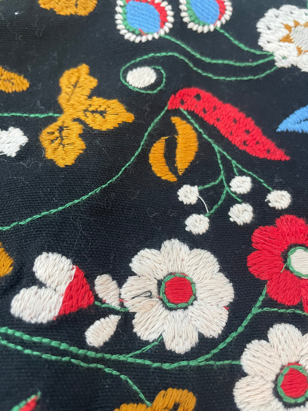 Falda Negra con diseño bordado de flores Multicolor. Altura modelo 1.76.