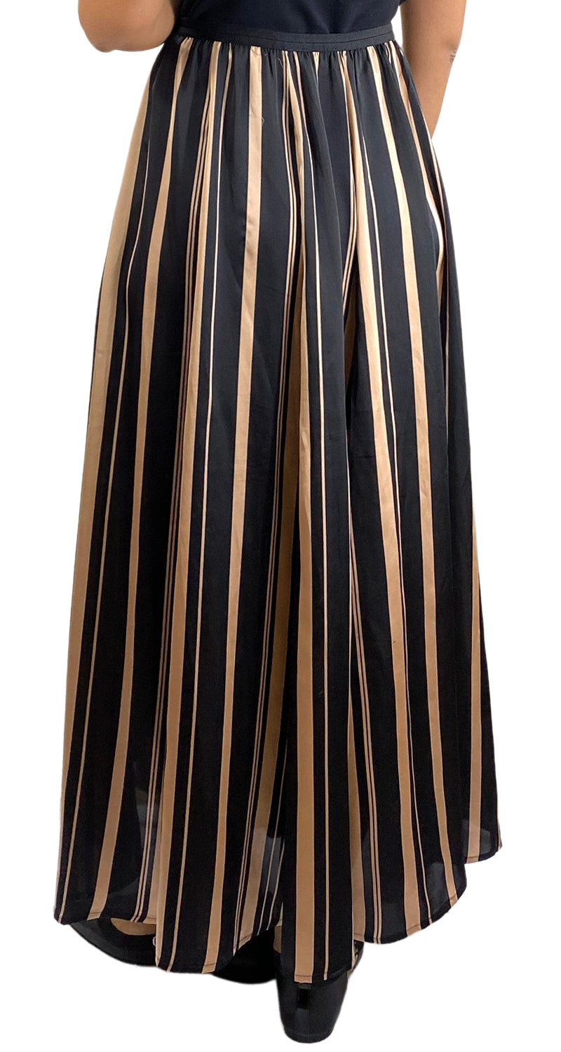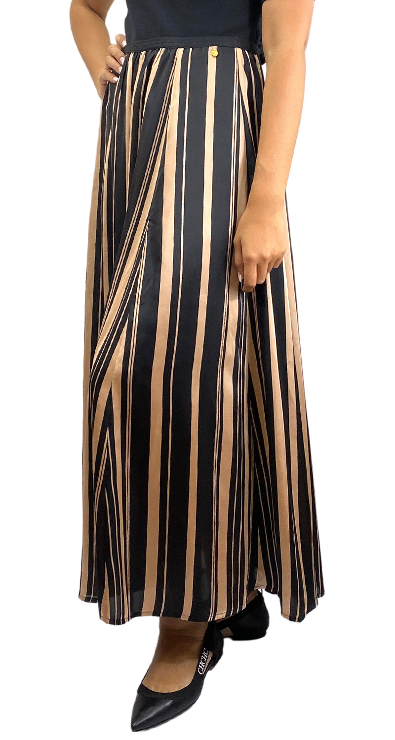 Falda Maxi a rayas en color Negro y Beige pretina elasticada. Altura de modelo 1,76 No especifica talla.