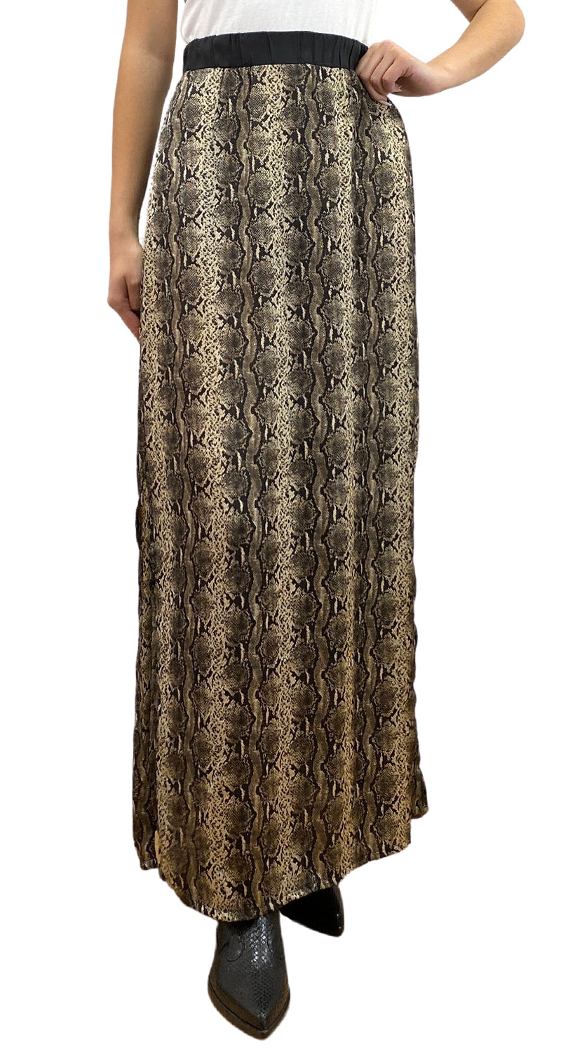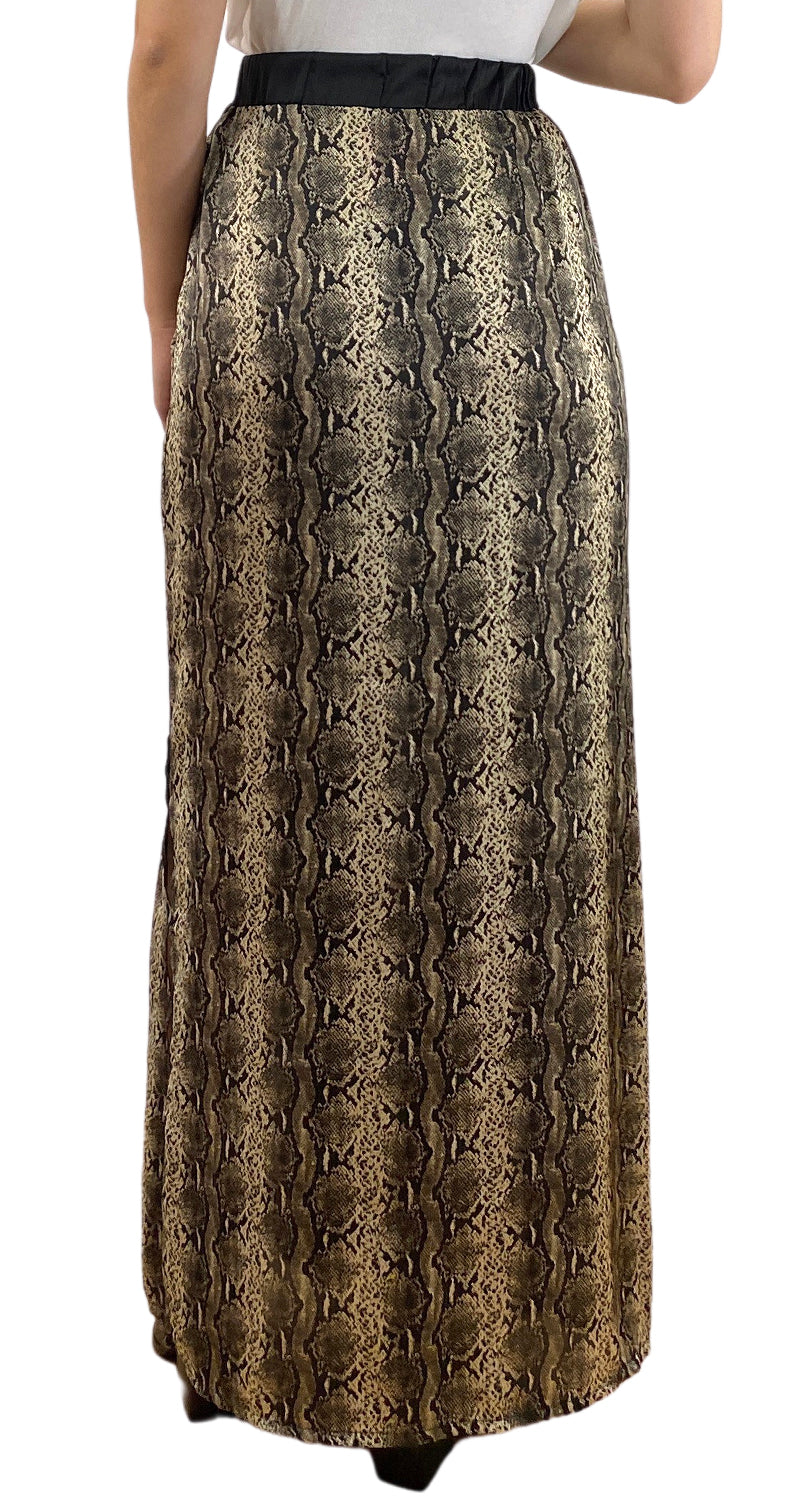 Falda Maxi con estampado de serpiente, abertura y bolsillos en laterales, pretina Negra elasticada. Altura de modelo 1,68
