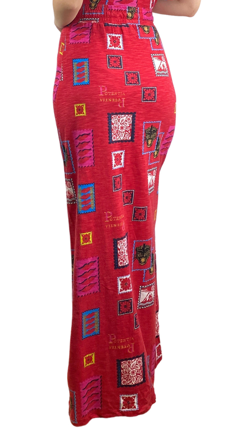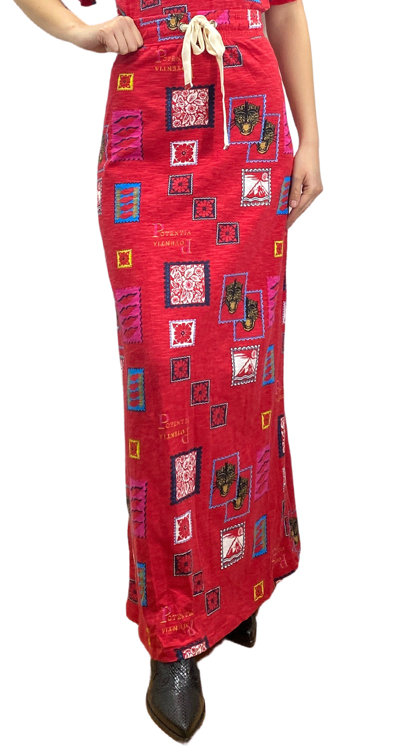 Falda color Rojo con estampado de estampillas, tiene cinta ajustable en cintura. Talla 1 de la marca