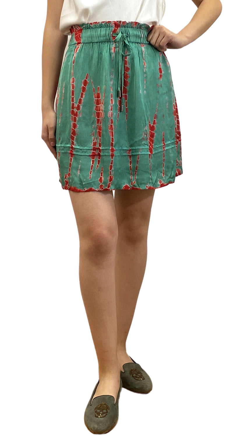 Falda Mini con estampado Tie Dye en Verde y Rojo, pretina elasticada y con lazo. Altura de modelo 1,68