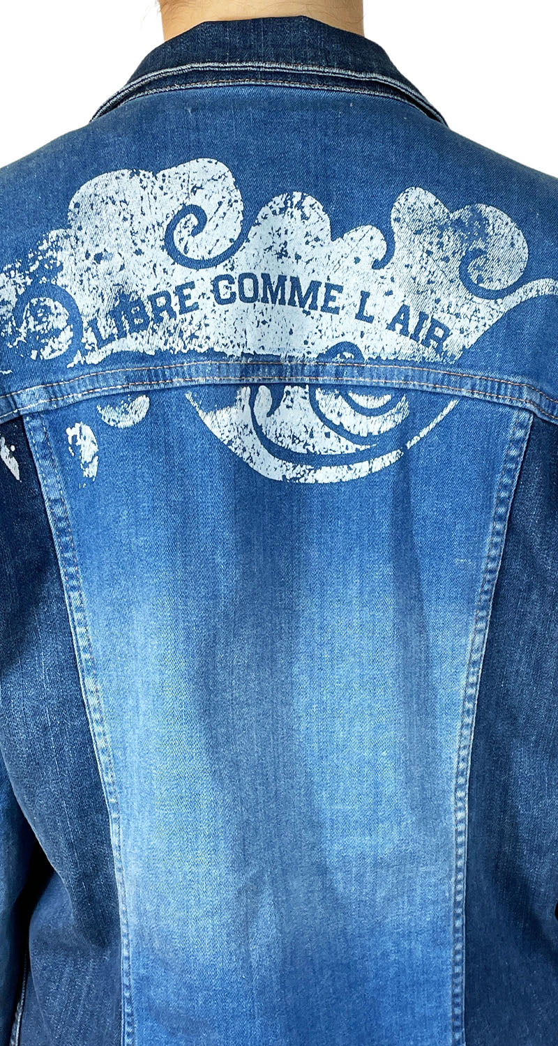 Chaqueta larga bicolor de mezclilla con bolsillos en delantero y diseño color Blanco en espalda.