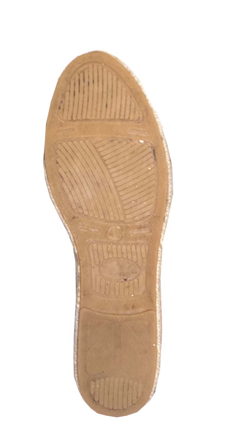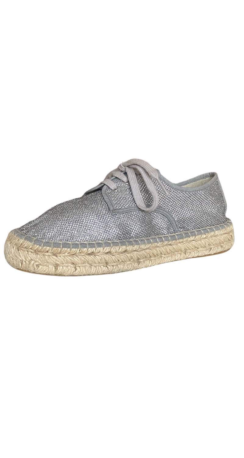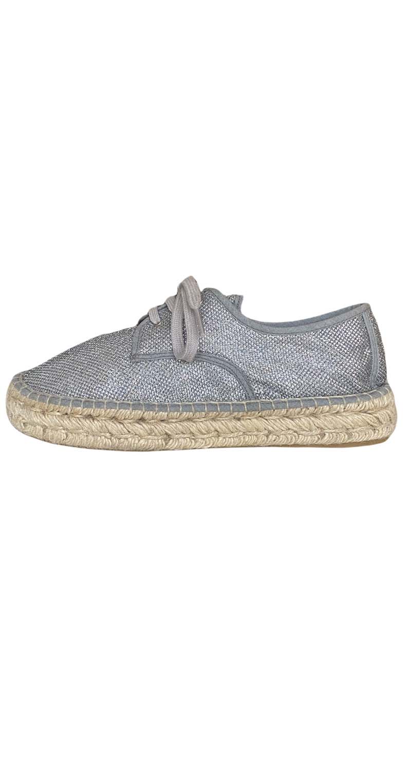 Zapatos tipo alpargatas con diseño de fibras metalizadas y cordones color Gris. Presenta leves signos de uso en suela.