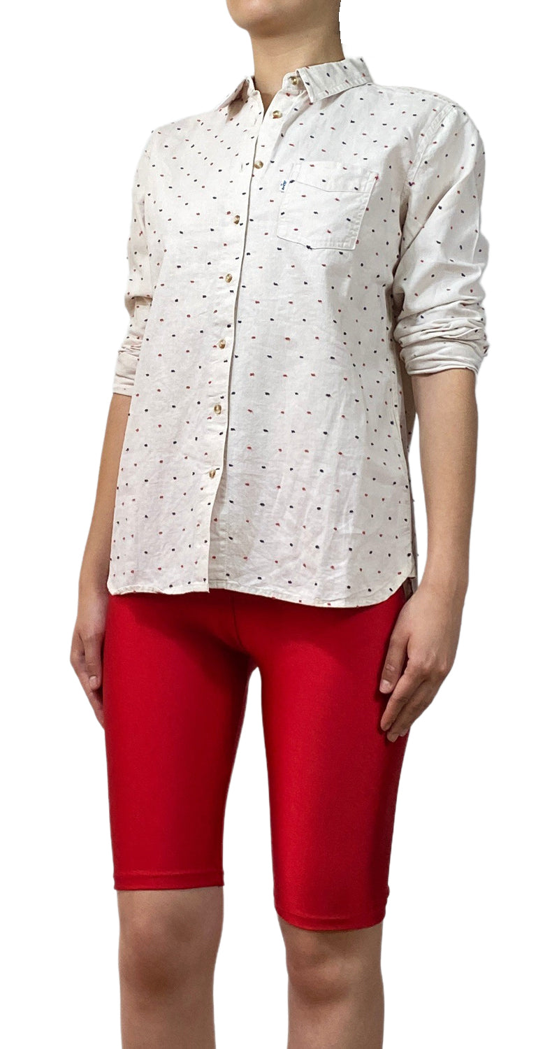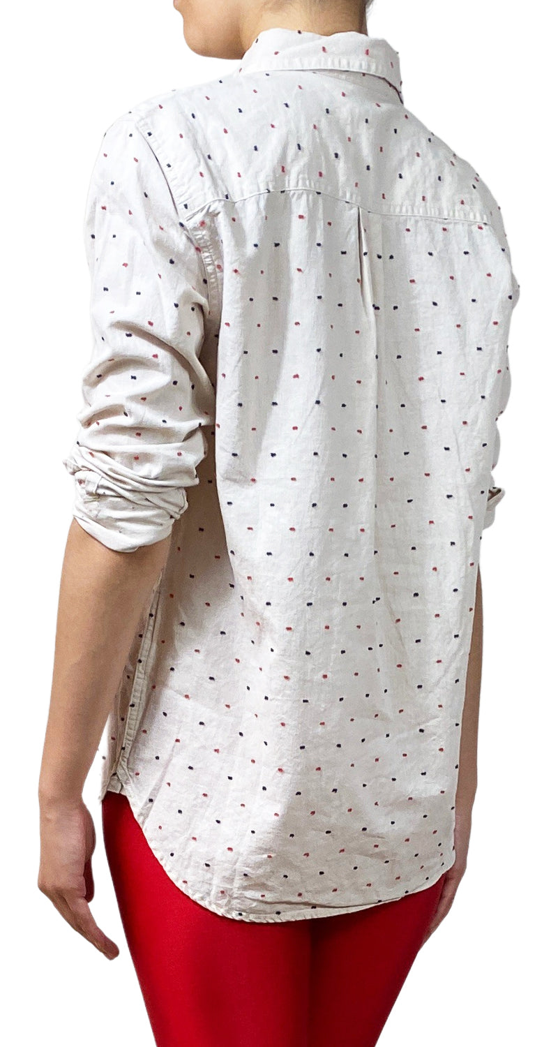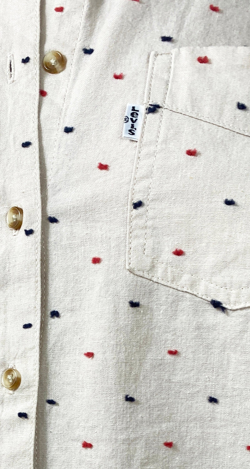 Blusa Beige con aplicación de hilos multicolor, botones en delantero y bolsillo.