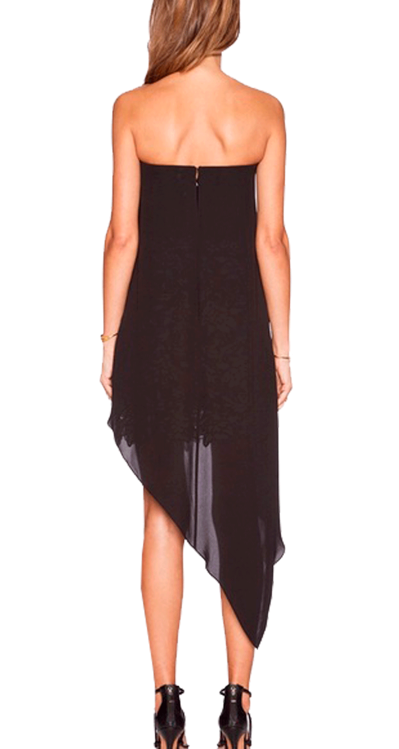 Vestido corto corset strapless con falda de tejido de flores en macramé y detalles en distinta tela.
