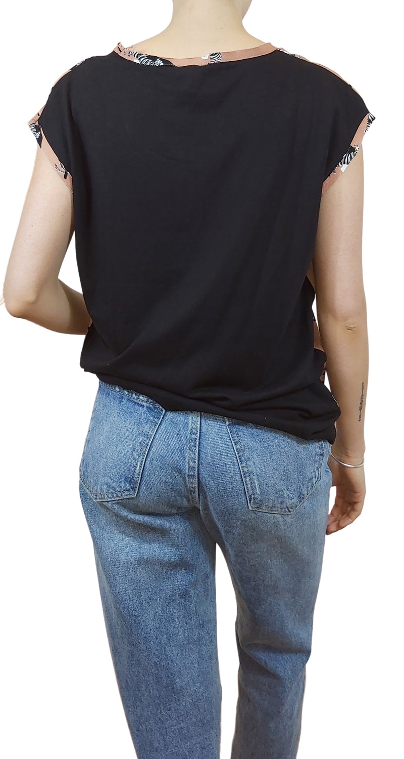 Polera sin mangas, escote redondo, color Rosa con estampado de panteras. Pequeño piquete casi imperceptible.
