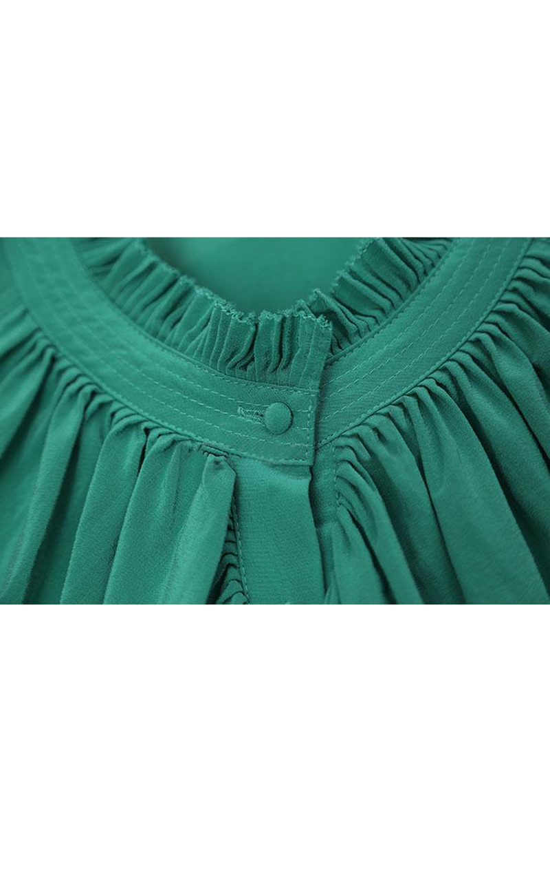 Blusa de seda con volante en el escote. De look romántico, bohemio y lujoso. Tiene en las mangas y basta un look antiguo con plisados, pliegues y vuelos, se puede usar abierta tipo kimono corto.