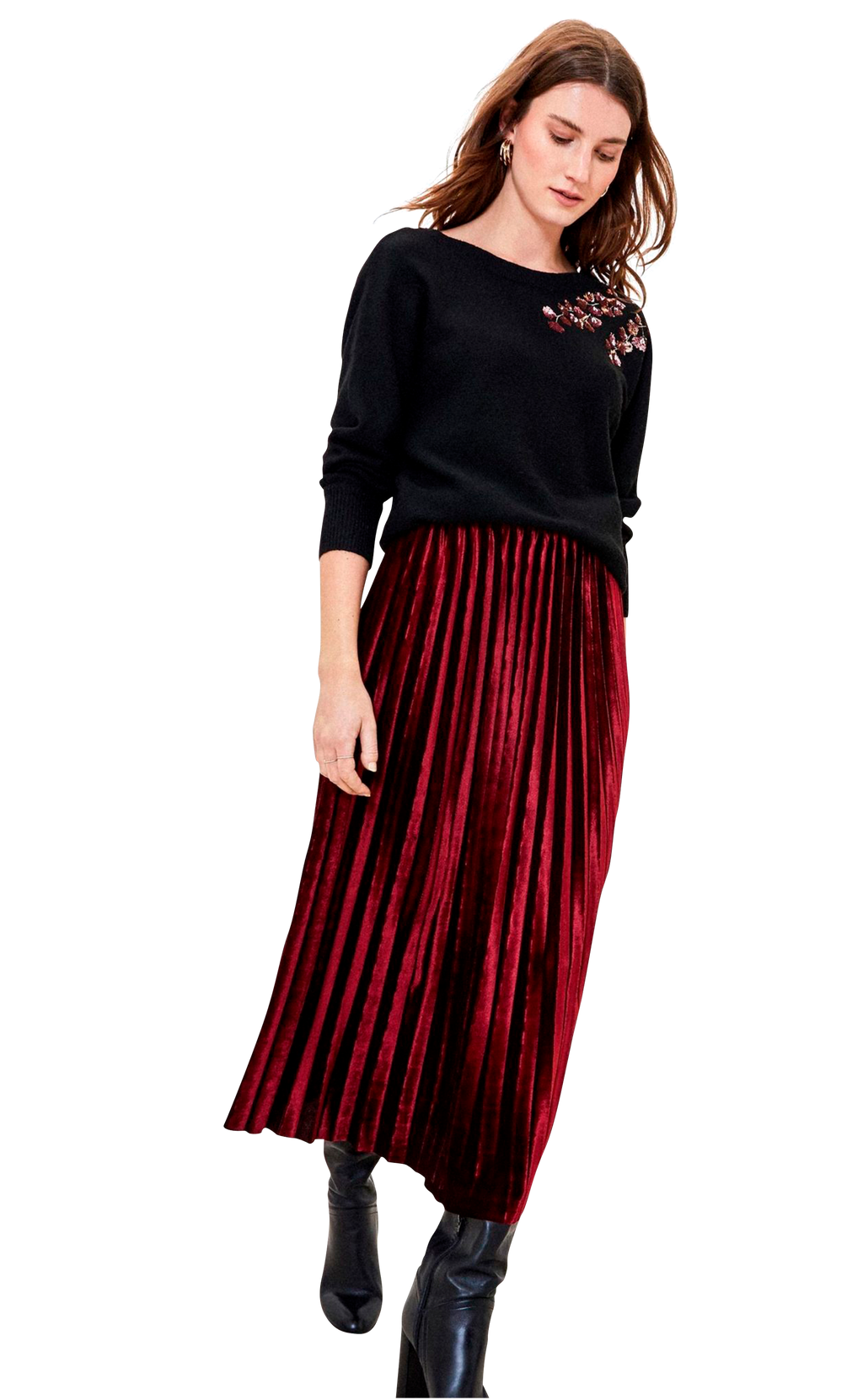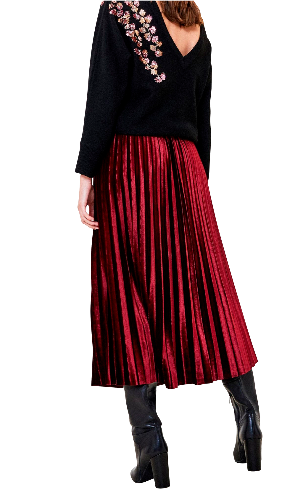 Falda midi plisada color Burdeo. Con textura de terciopelo.