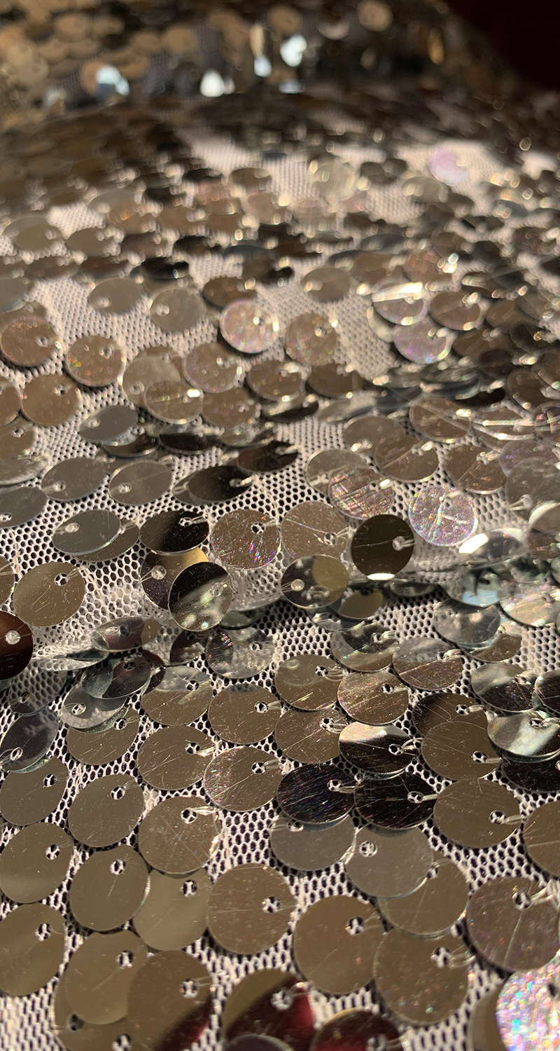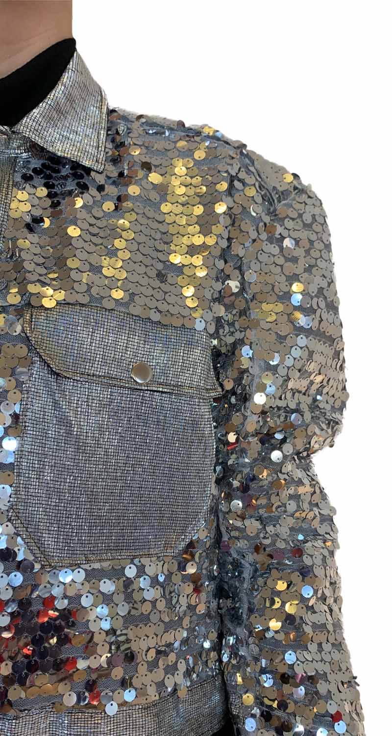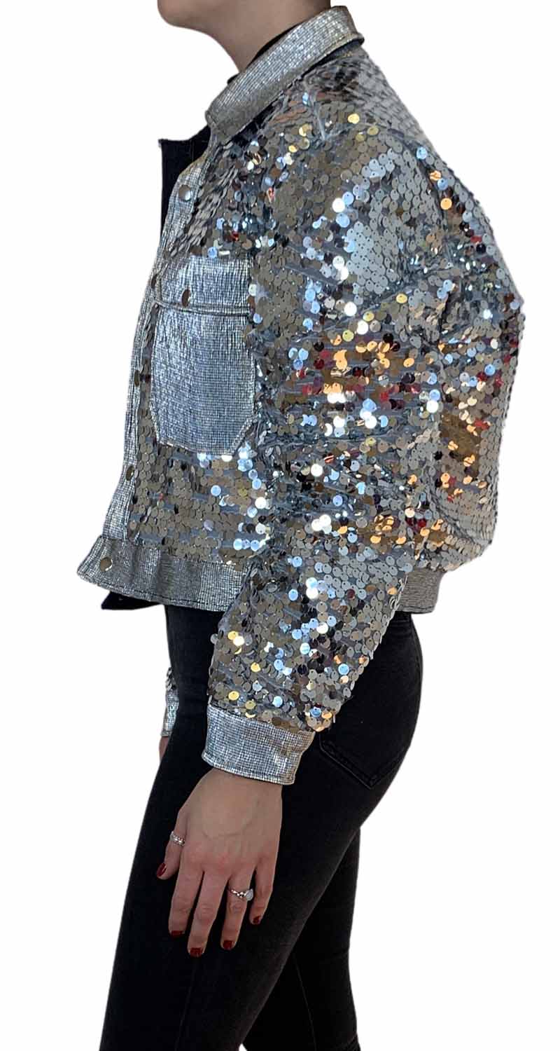 Chaqueta de denim con lentejuelas Plateadas. Bolsillos, cuello, tapeta frontal y ruedo de color Plateado estilo craquelado.