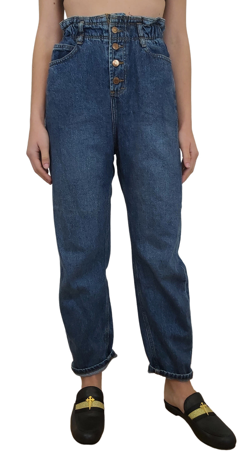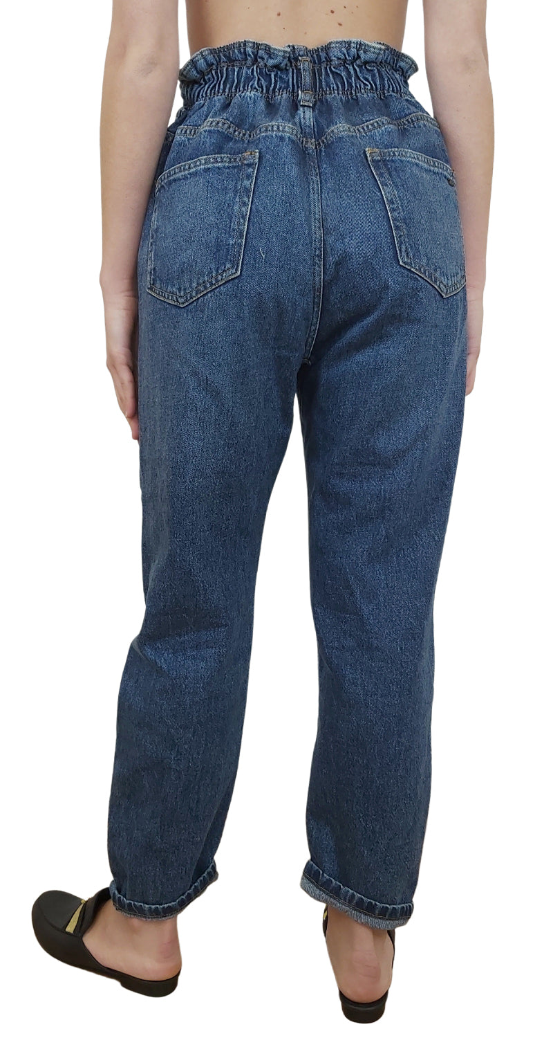 Pantalón color Negro, estilo mom jeans, tiro alto con pretina elasticada y bolsillos delanteros y traseros.