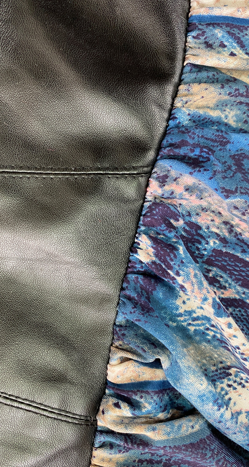 Vestido color Azul con estampado reptil en azul y top de cuero.