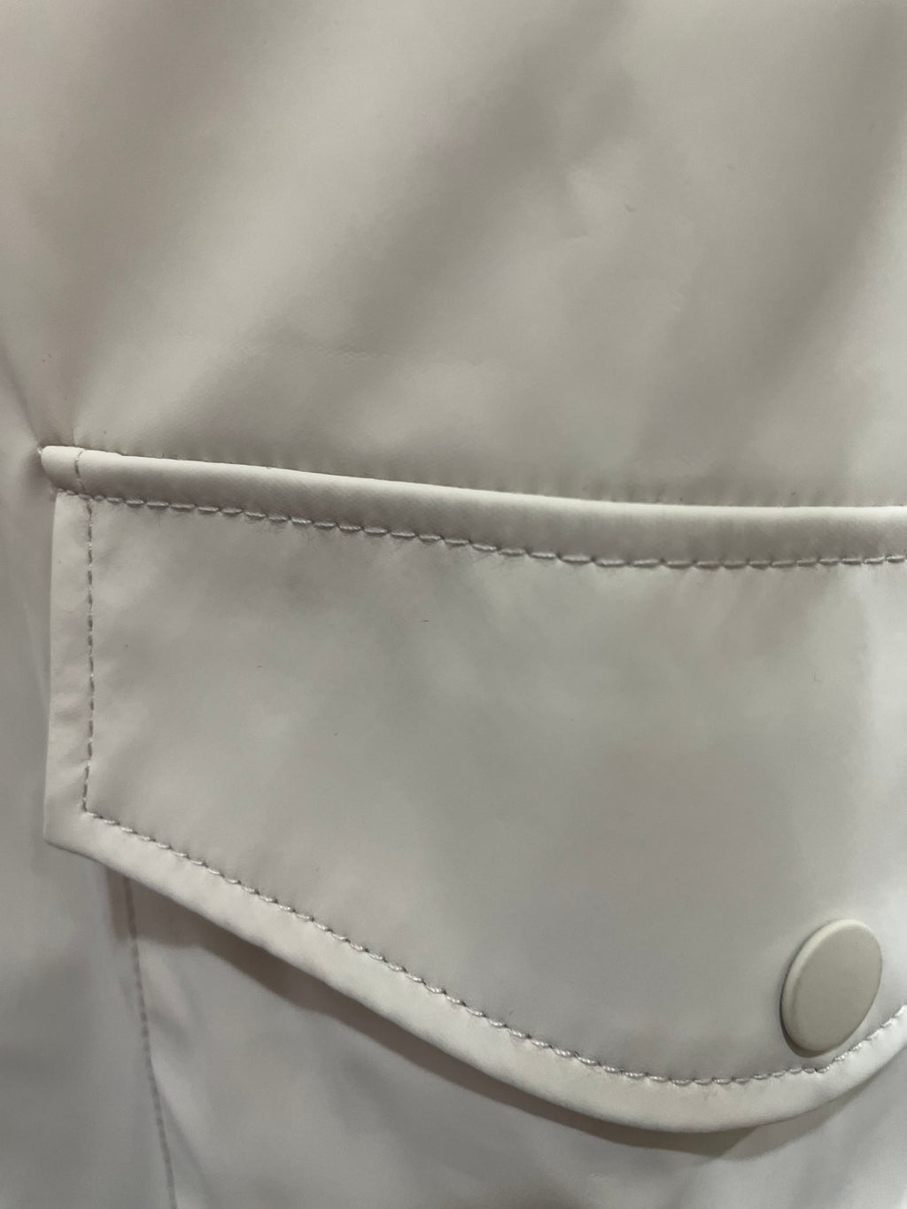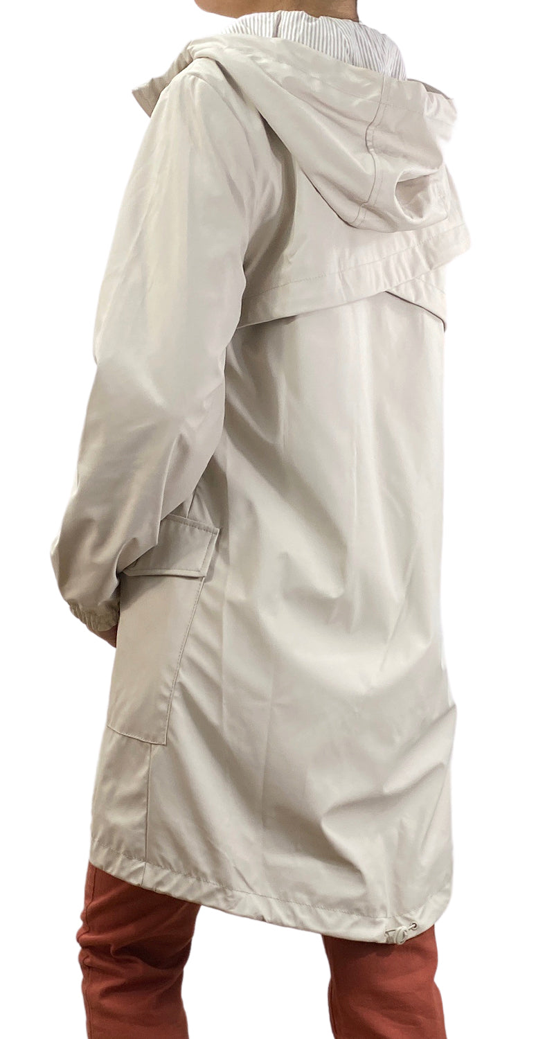 Impermeable color Marfil con capucha y bolsillos frontales.