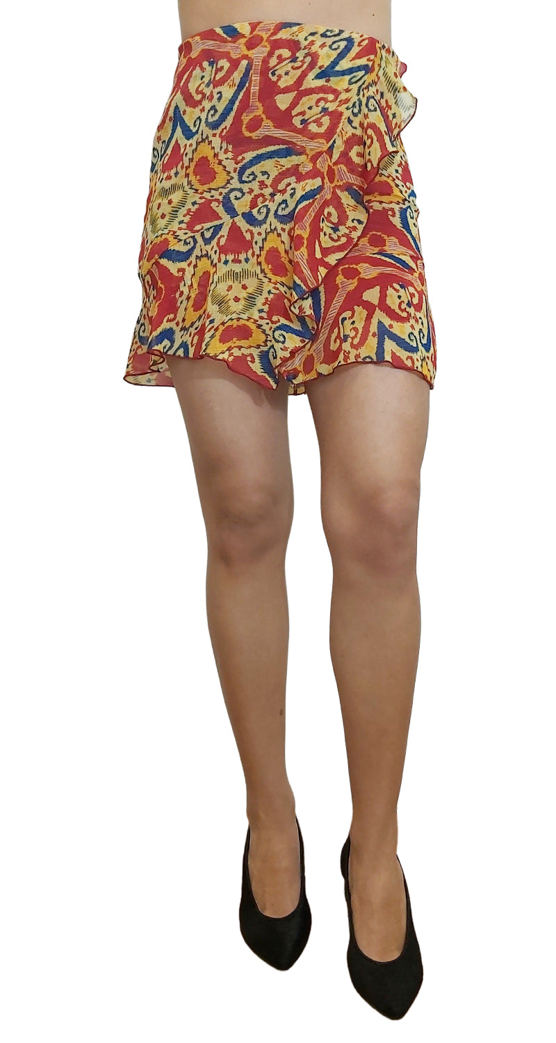 Falda tipo Mini de gasa estampada en colores Rojo, Amarillo y Azul. Con vuelos en delantero.