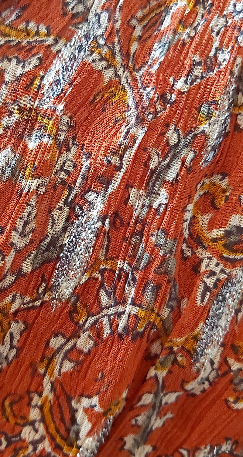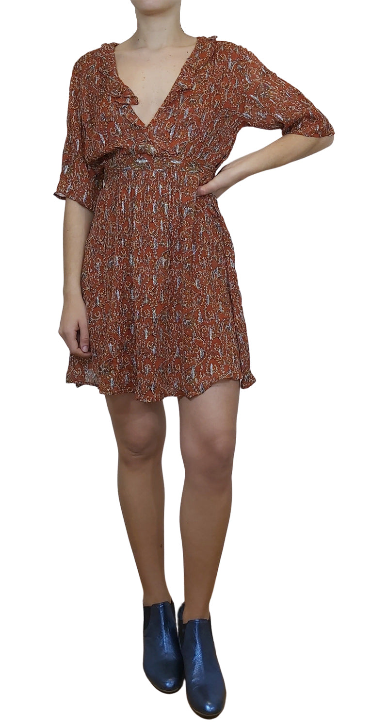 Vestido mini color Terracota con estampado Paisley y detalles en fibras metalizadas. Escote cruzado y pronunciado con volantes.