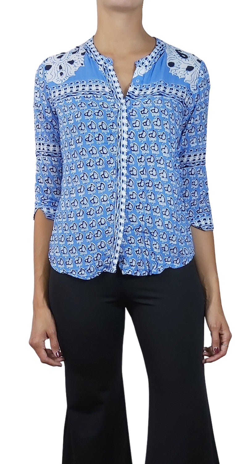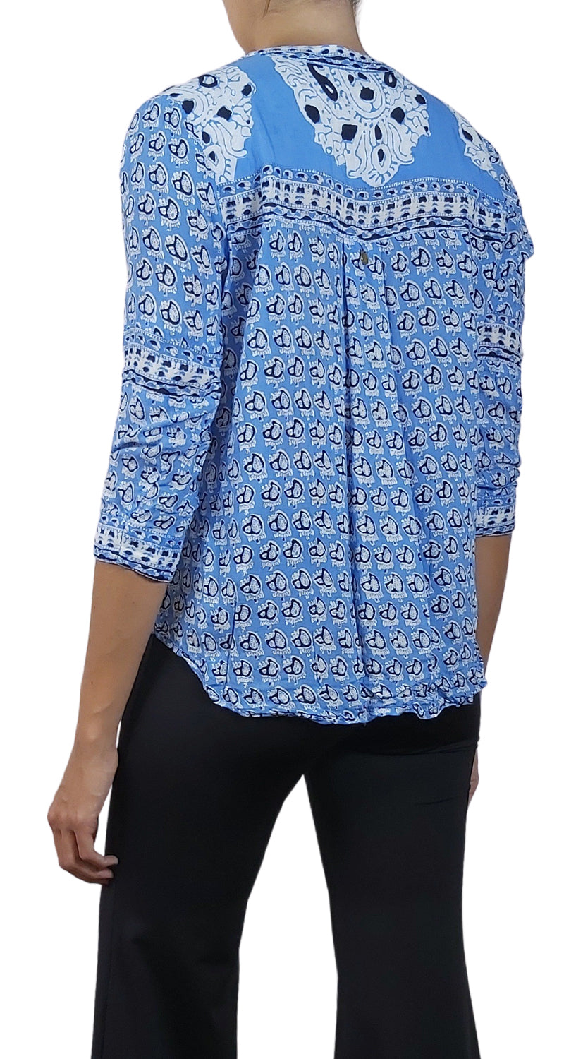 Blusa color Azul con diseño de estampado estilo Paisley.