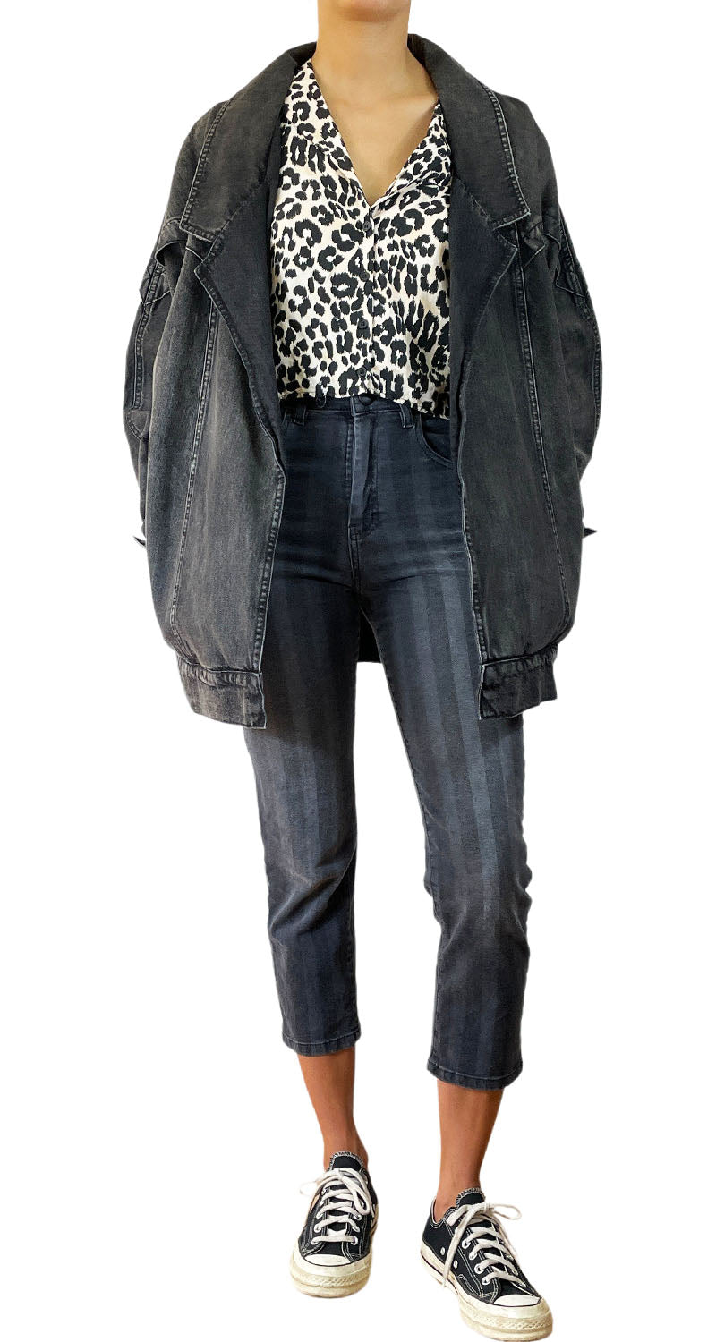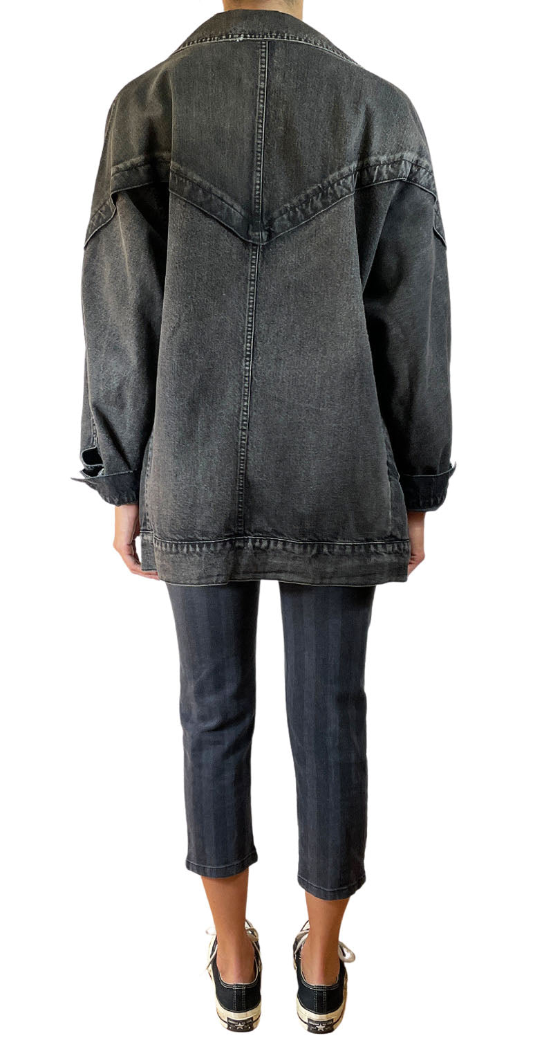 Chaqueta negra estilo oversize con bolsillos laterales.