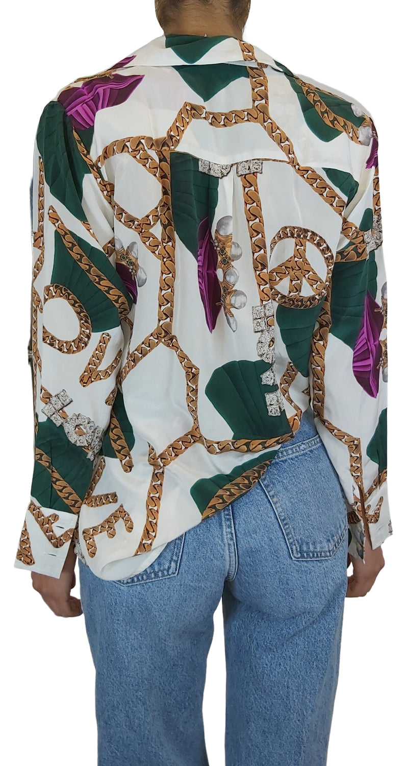 Blusa color Blanco con estampado de besos, cadenas, coronas y hojas. También tiene un pequeño vuelo color Negro en la parte superior izquierda. Talla 2 de la marca.