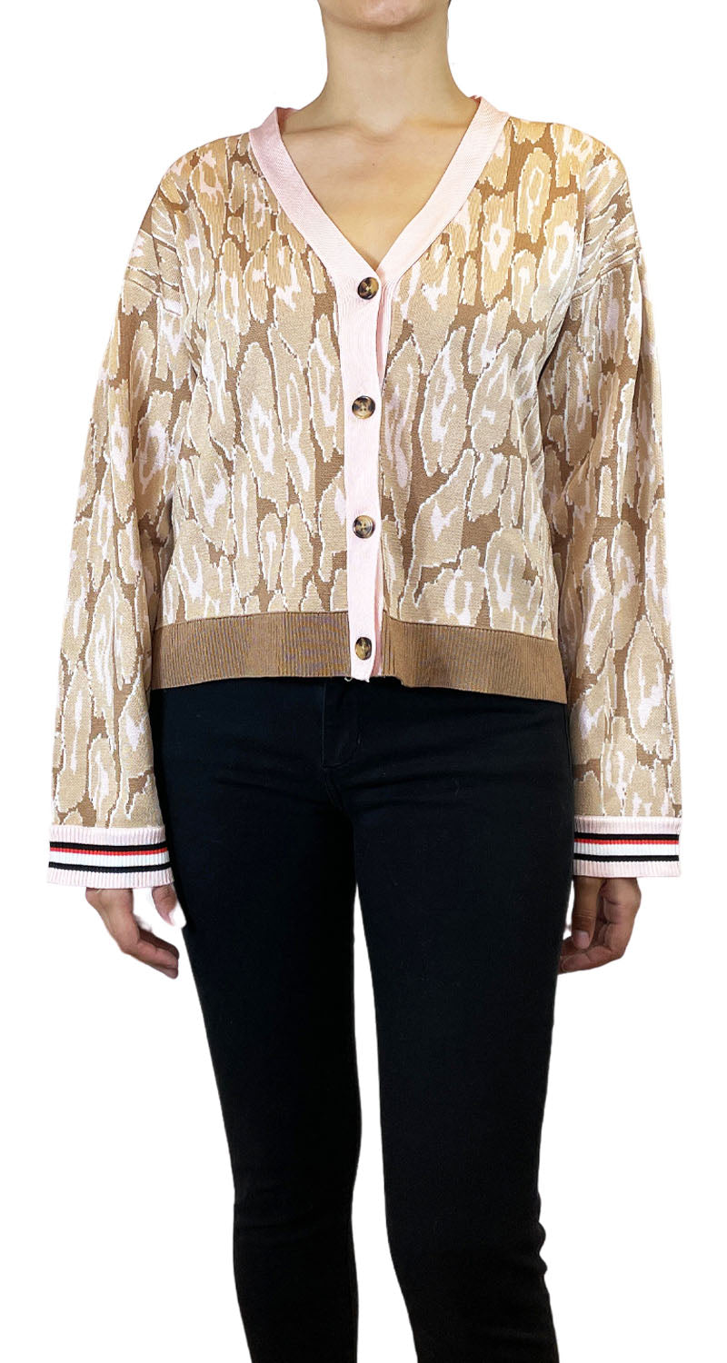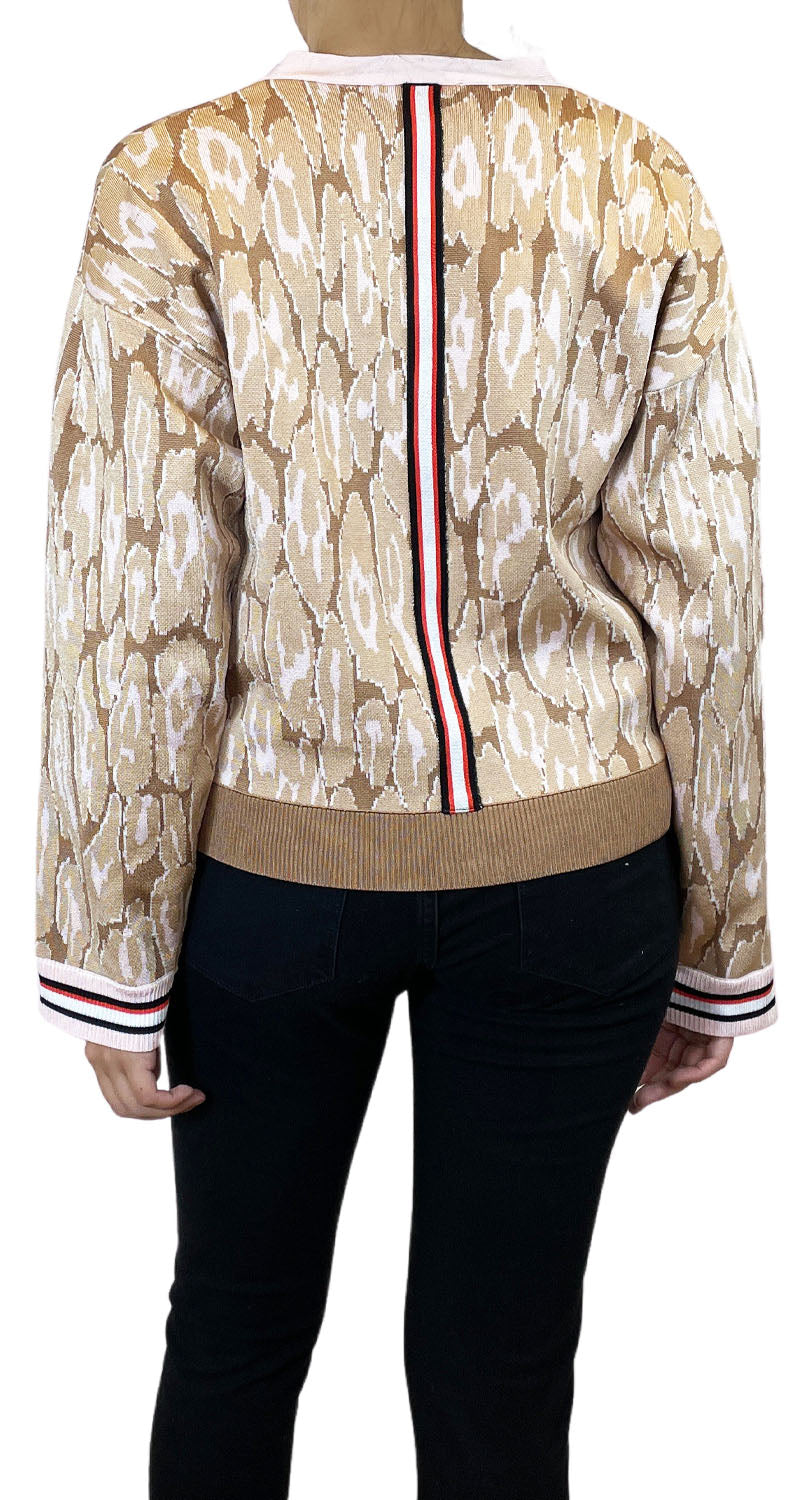 Cardigan con diseño Animal Print en color Rosa y Camel. Franjas decorativas en puño y espalda en color Negro, Rojo y Blanco. Talla 3 de la marca.