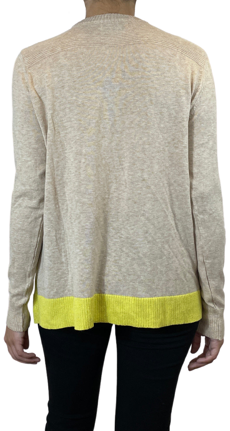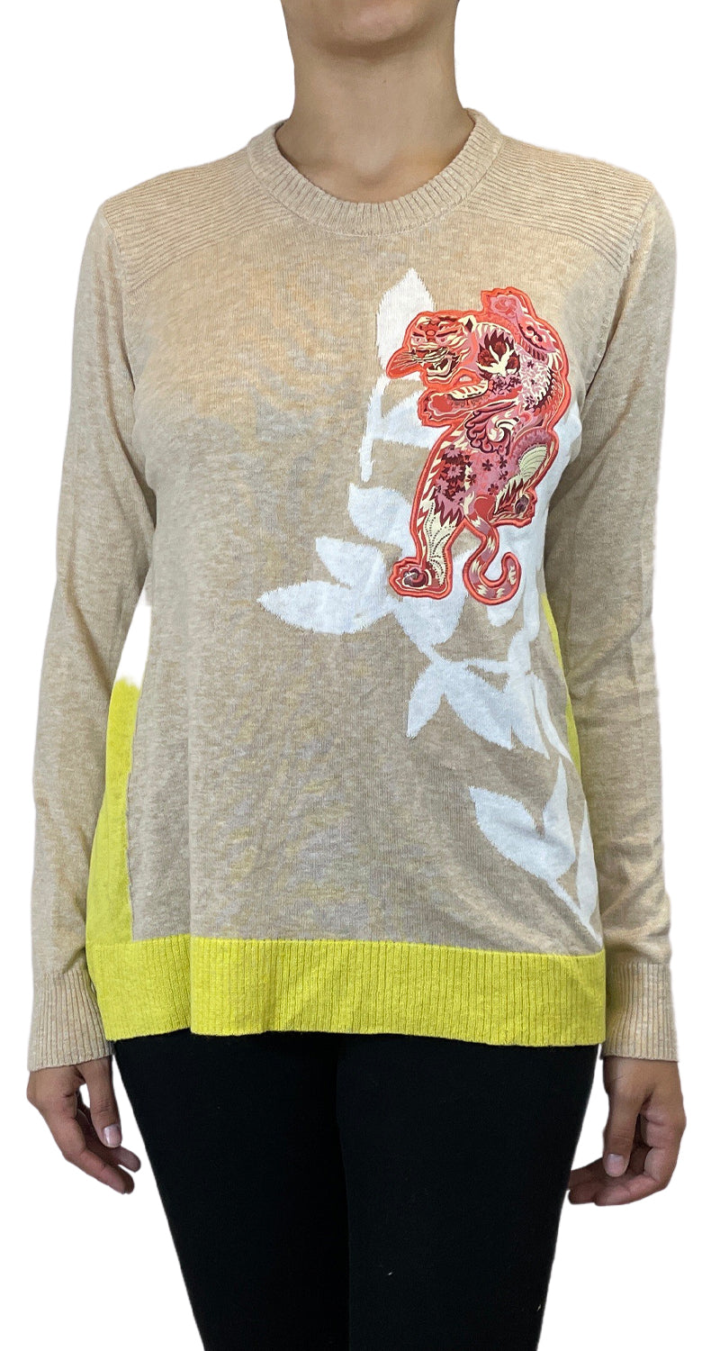 Sweater cerrado color Beige, posee un tigre bordado en hombro delantero, posee detalles color Amarillo. Talla 2 de la marca.