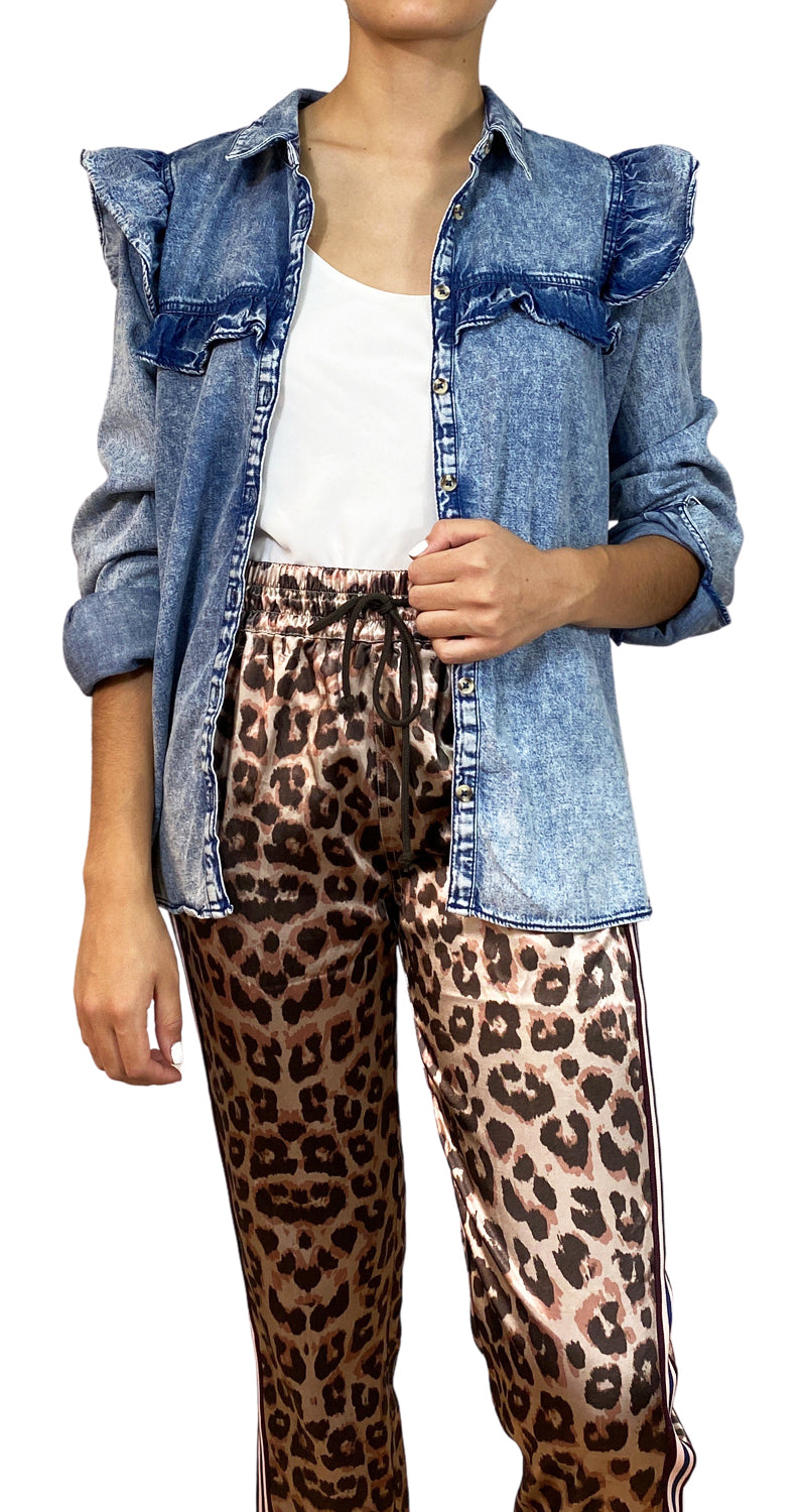 Blusa Denim con efecto deslavado y detalles de vuelos.