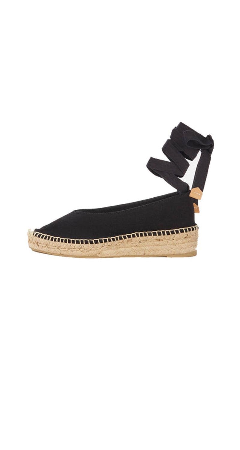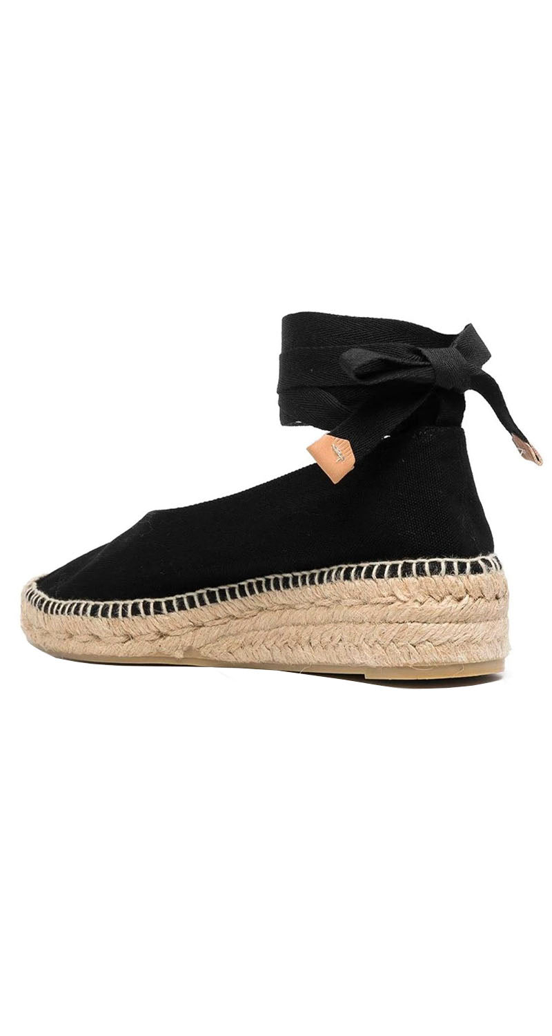 Alpargatas Negras con empeine en V y cinta en tobillos.