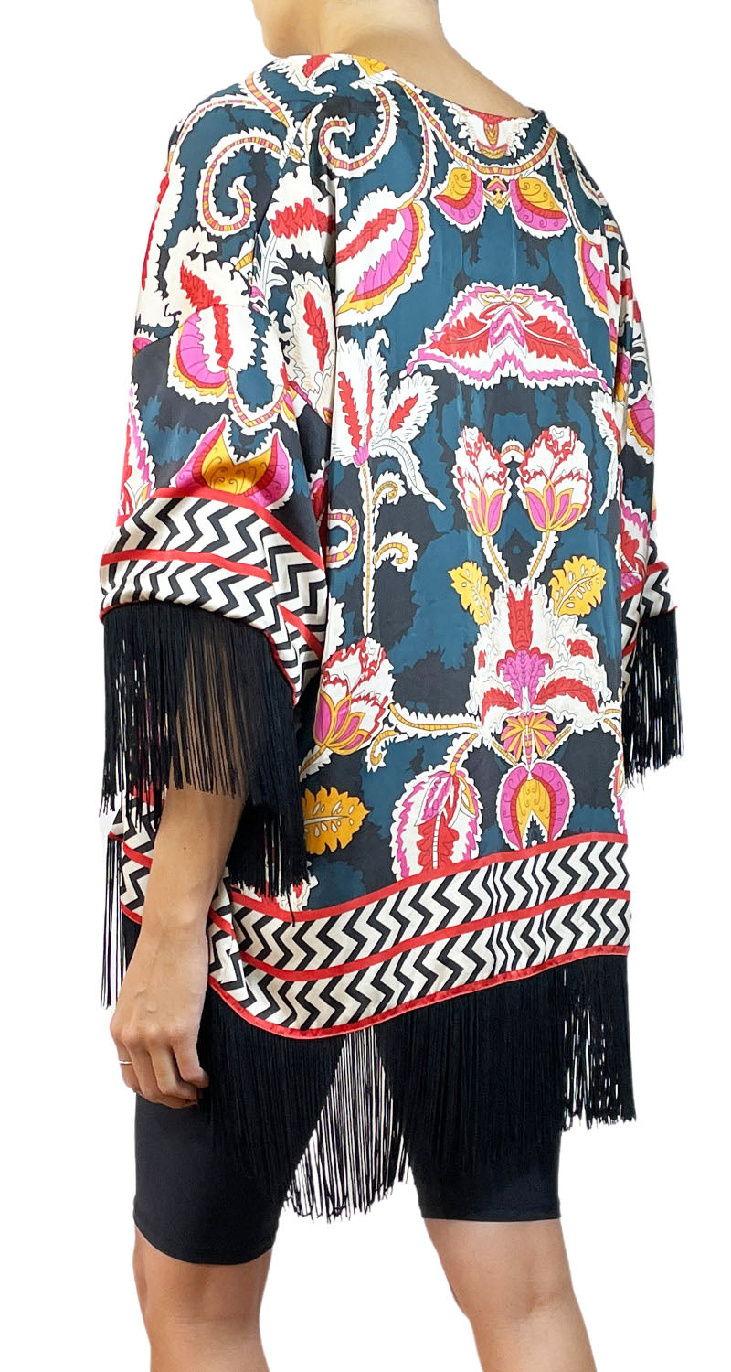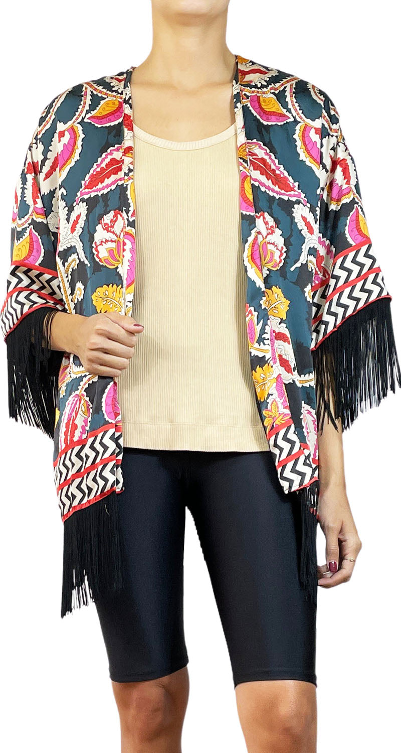 Kimono Verde con estampado multicolor y flecos en ruedos.