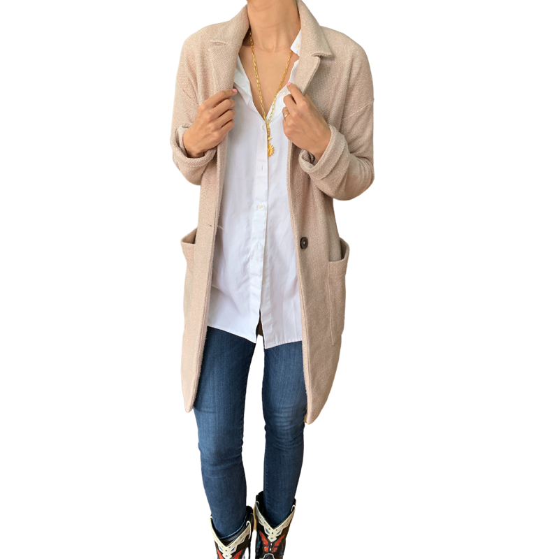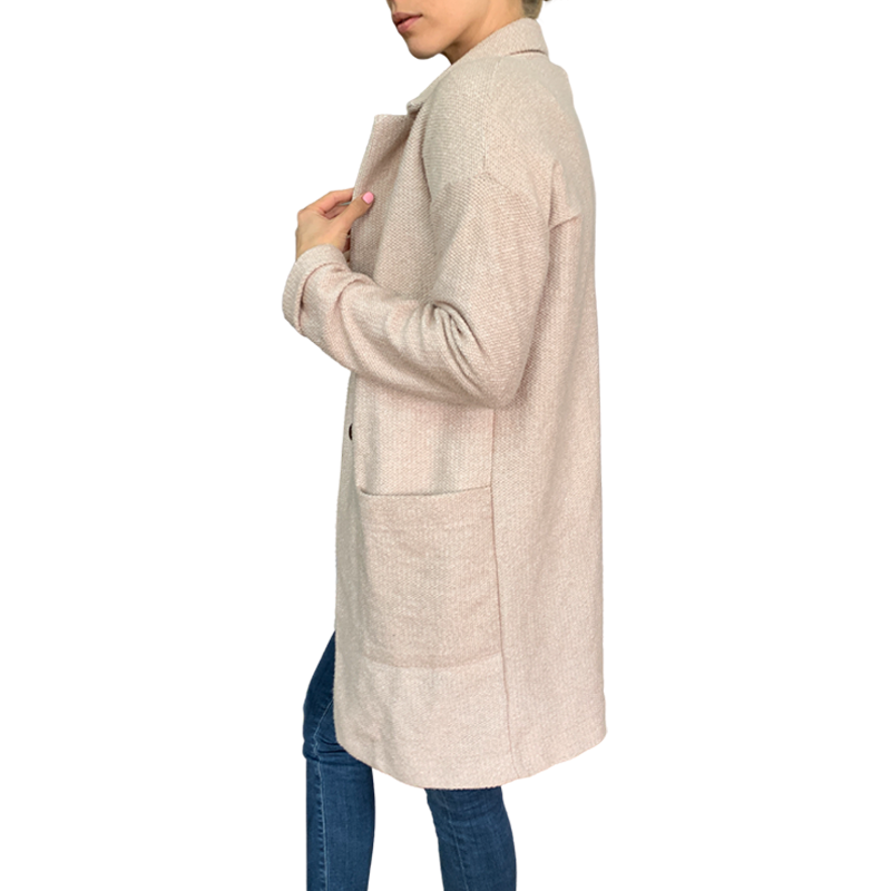 Abrigo tipo cardigan tejido en color Rosa Palo , con bolsillos de plastrón en ambos delanteros.