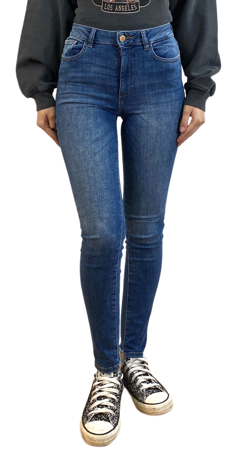 Jeans color Azul de 5 bolsillos, con diseño desflecado en ruedos, cierre y botón frontal. Talla 26 de la marca. Altura de modelo 1,68