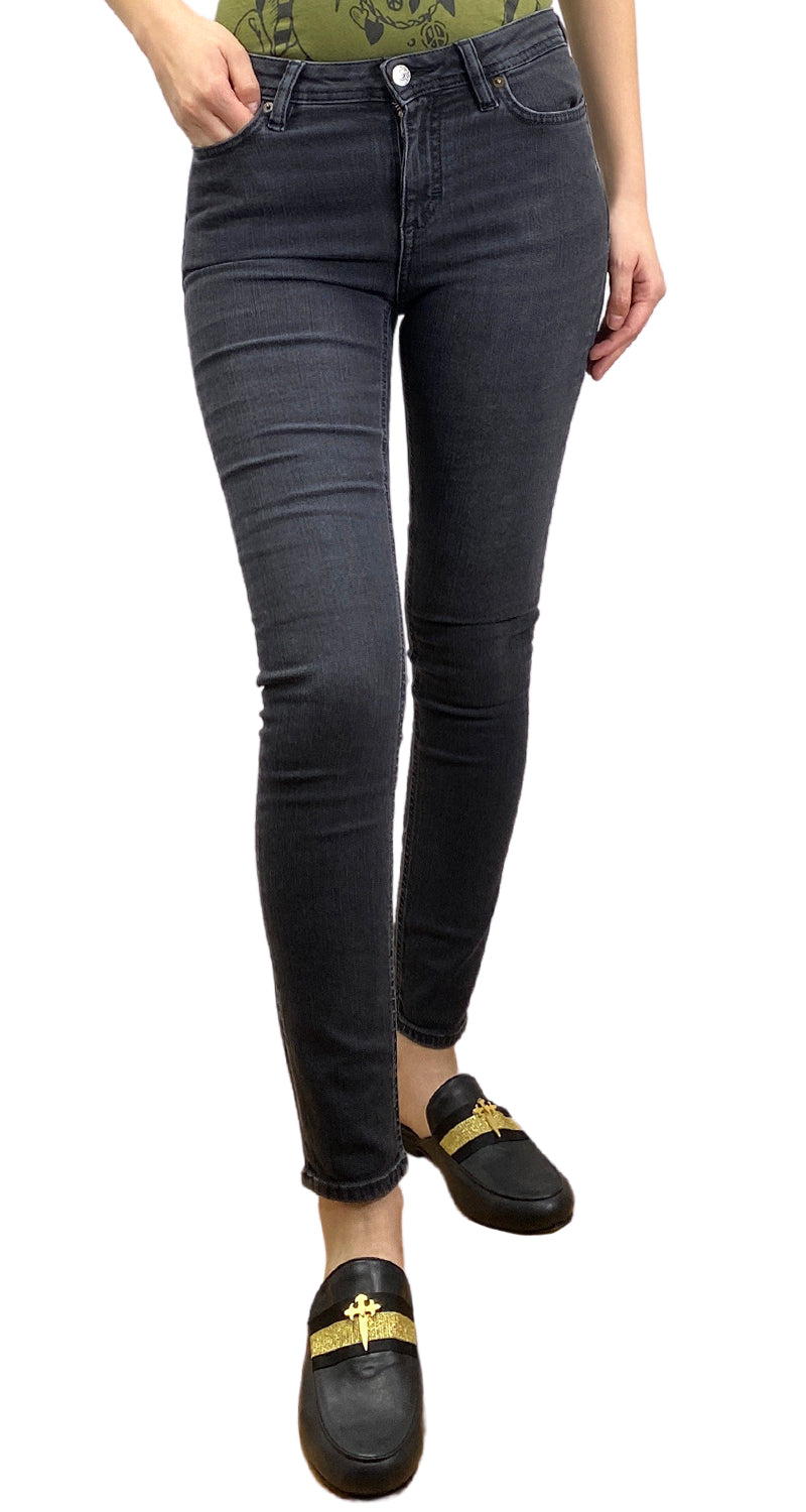 Jeans color Negro con 5 bolsillos, cierre y botón frontal. Talla 24 de la marca. Altura de modelo 1,68