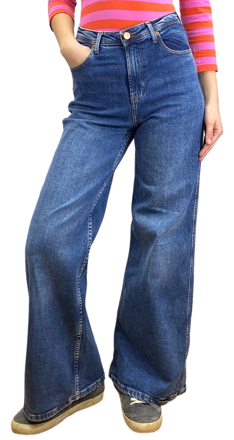 Jeans estilo Palazzo en color Azul con 5 bolsillos, cierre y botón frontal. Talla 40/24 de la marca. Altura de modelo 1,68