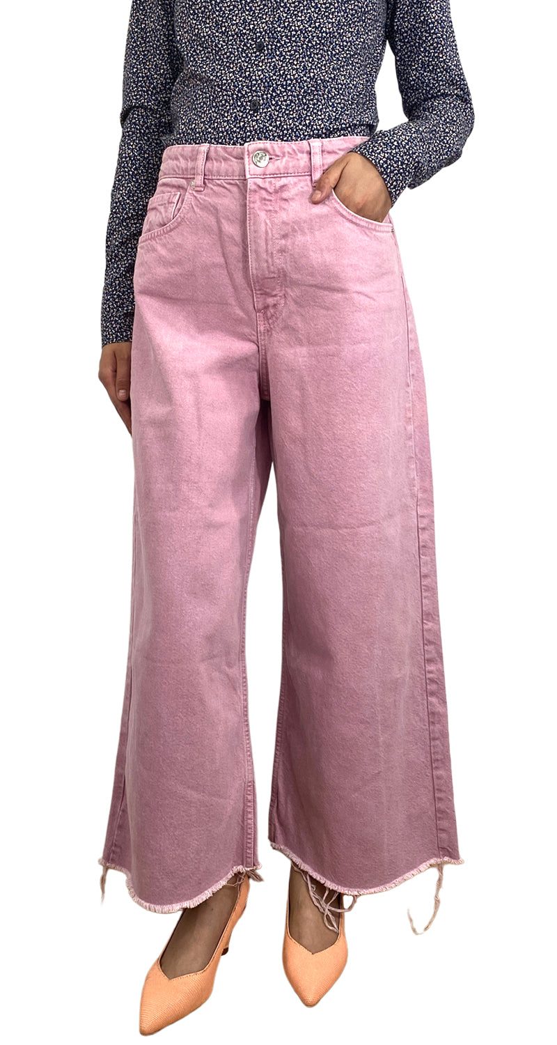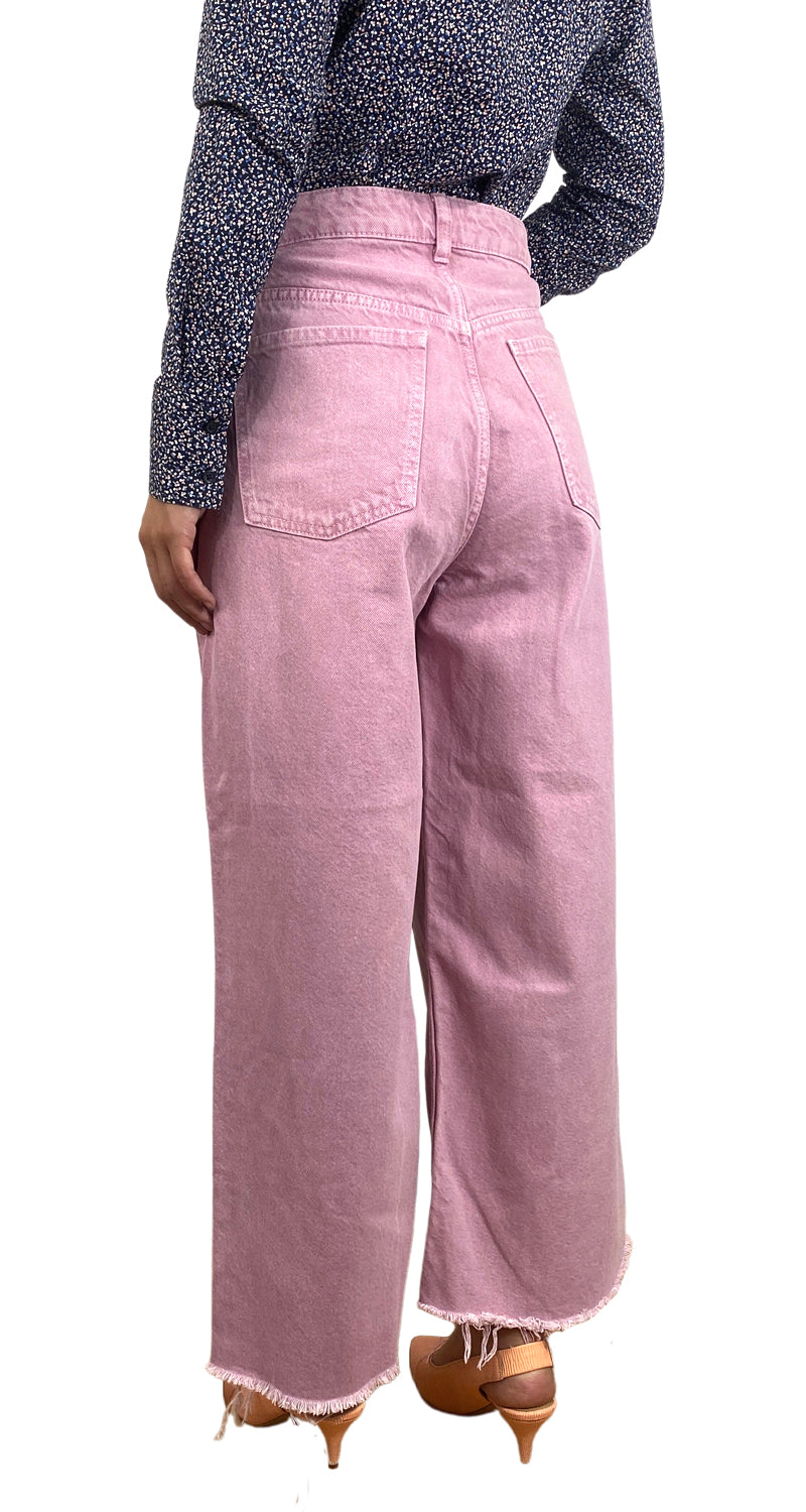 Jeans Denim color Rosado estilo palazzo, modelo 5 bolsillos con ruedo desflecado.