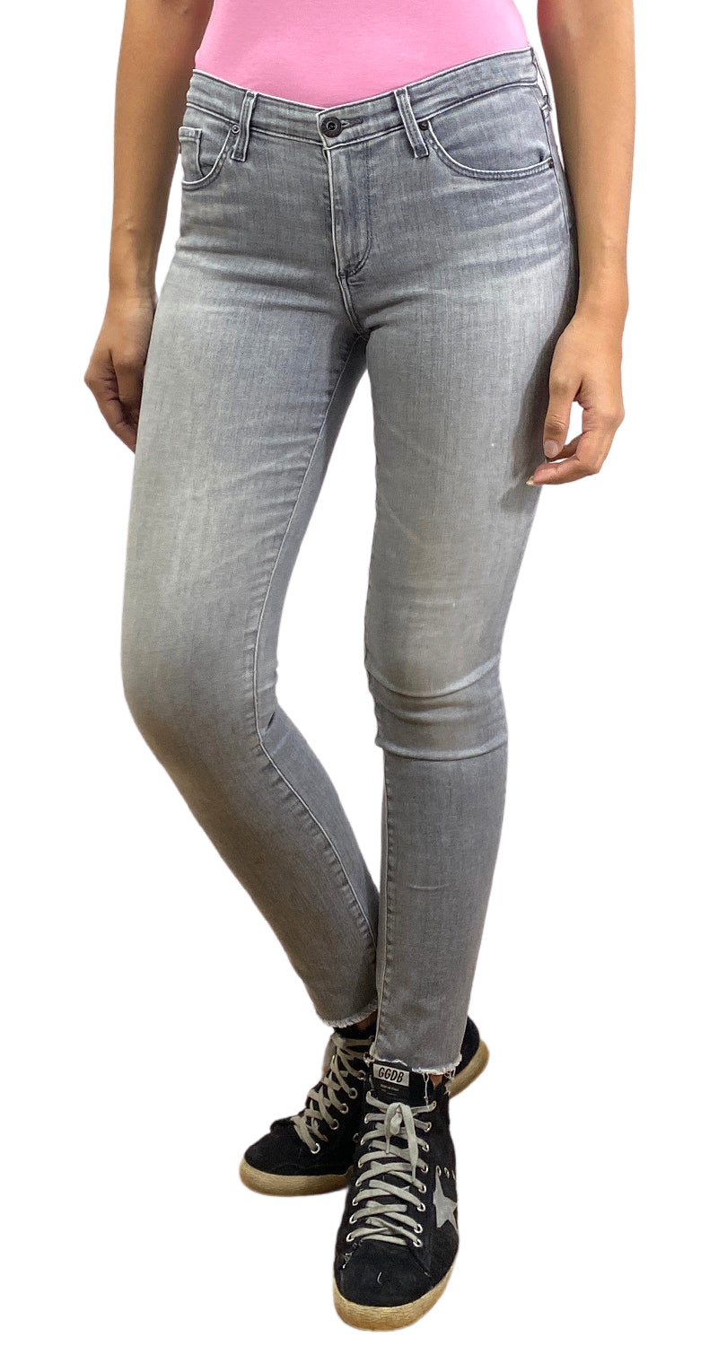 Jeans color Gris deslavado, con 5 bolsillos y ruedos desflecados, abertura en tobillos. Talla 27 de la marca. Altura de modelo 1,68.
