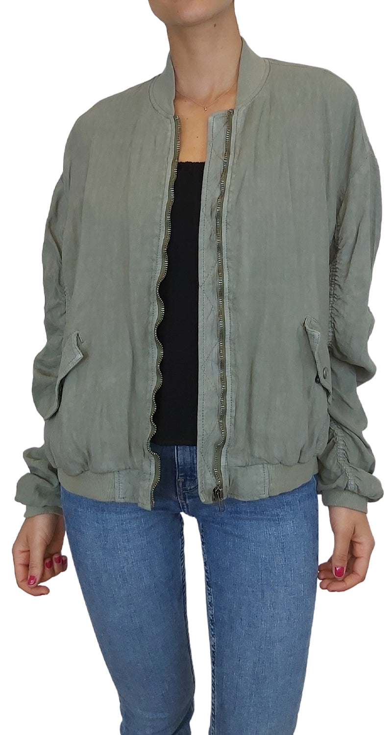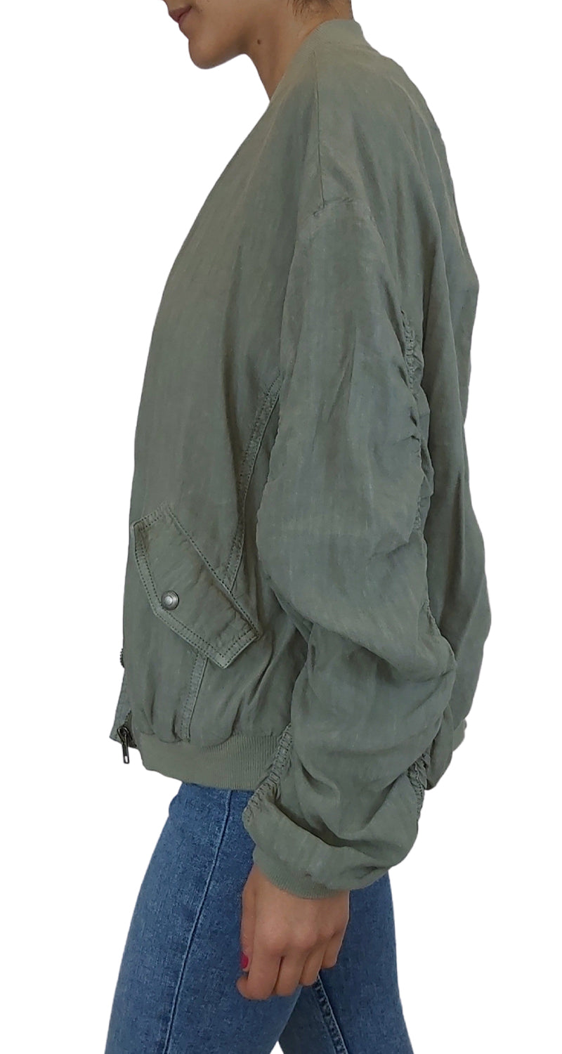 Chaqueta tipo bomber Verde militar. Detalle elasticos en mangas y espalda.