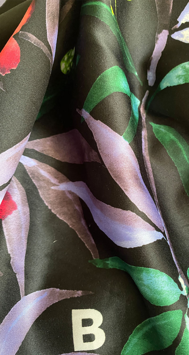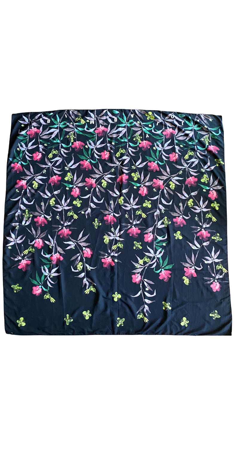 Pañuelo Negro con diseño naturaleza. Medidas 120 x 120 cm.